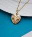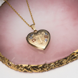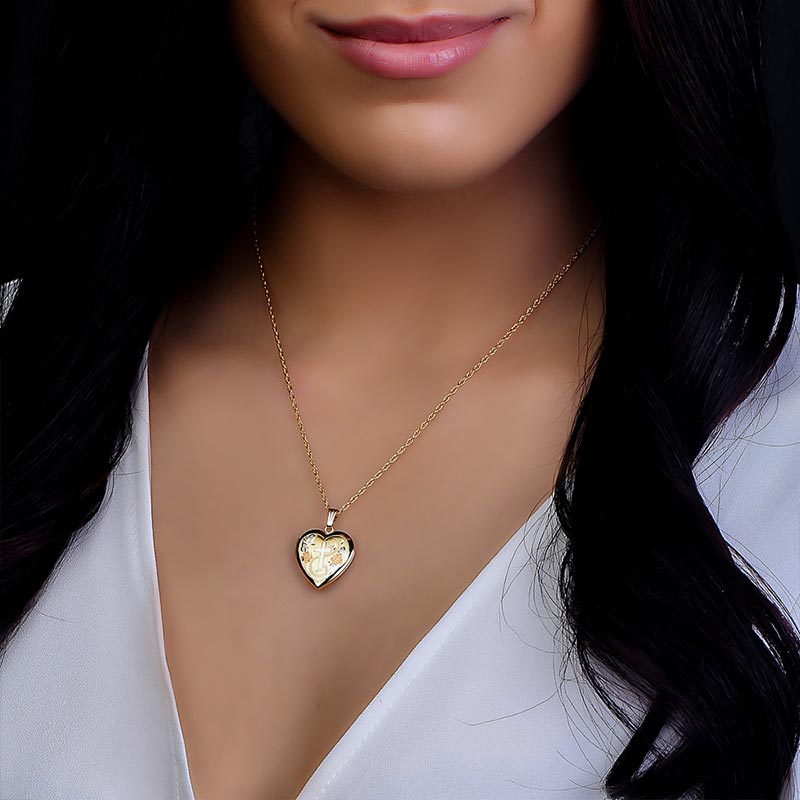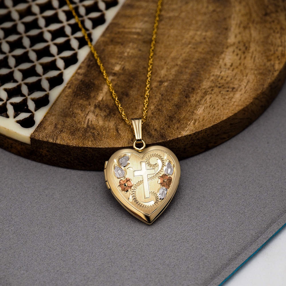 Solid 14K Yellow Gold Floral Cross Heart Photo Locket