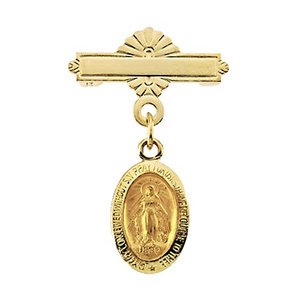 Baptism Brooch Pin is 2/3 inch x Under 1/2 Inch Tall. Baptism Brooch Can be engraved on the Front This Solid 14K Gold medal was created after a nun (now Saint) was given a vision of this exact medal front and back. The back features an "M" surmounted by an cross with two hearts and twelve stars. This is the most popular selling medal of all.