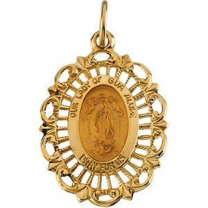 This Solid 14K Gold medal is a reproduction of the miraculous image Mary left on the robe (tilma) Juan Diego was wearing. Our Lady of Guadalupe is the patroness of the Americas and Mexico.