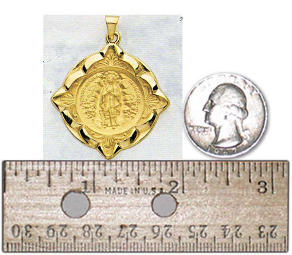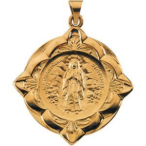 This Our Lady of Lourdes hollow Back Medal is all 14K Solid Yellow Gold. The beautifuly crafted scalloped boarder adds to this very detailed medal.