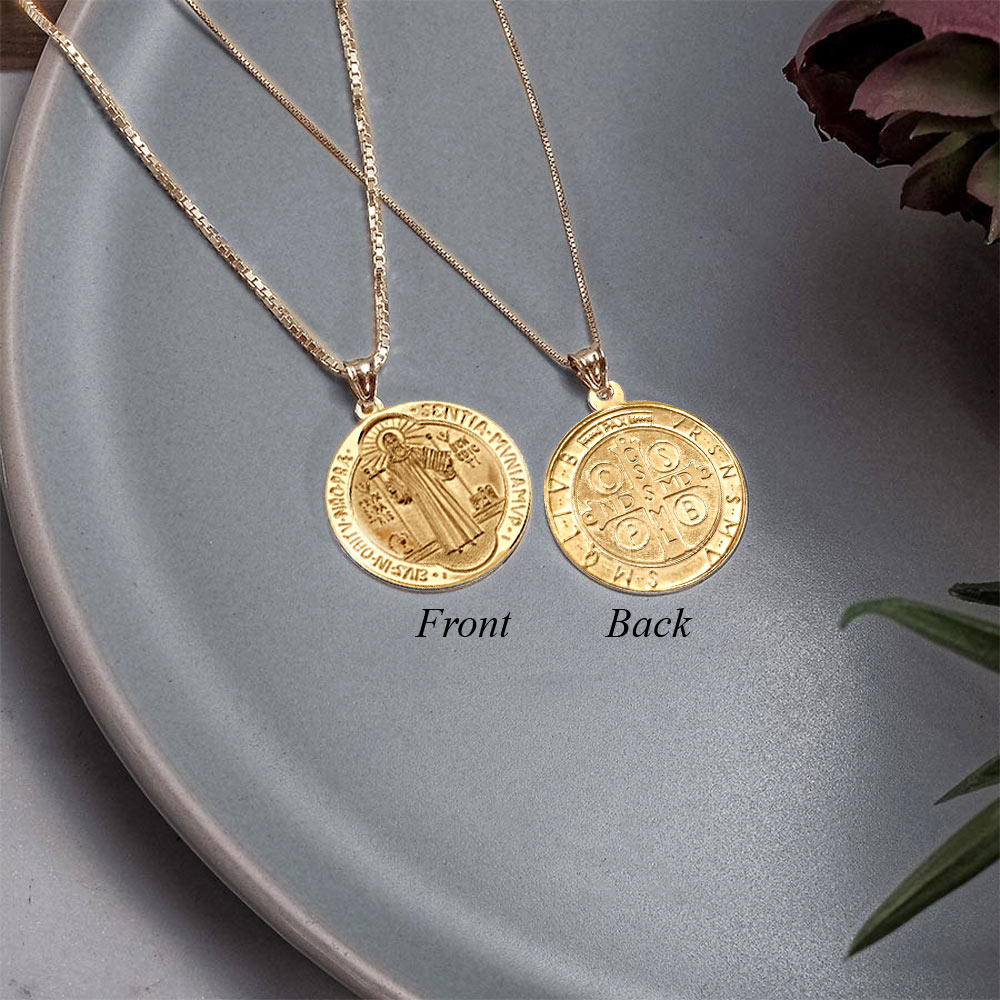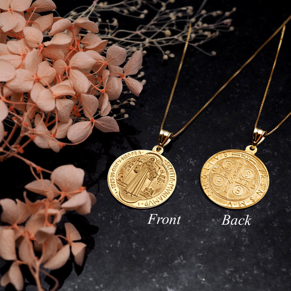 On the back of the medal, the cross is dominant. On the arms of the cross are the initial letters of a rhythmic Latin prayer: Crux sacra sit mihi lux! Nunquam draco sit mihi dux! (May the holy cross be my light! May the dragon never be my guide!). In the angles of the cross, the letters C S P B stand for Crux Sancti Patris Benedicti (The cross of our holy father Benedict).