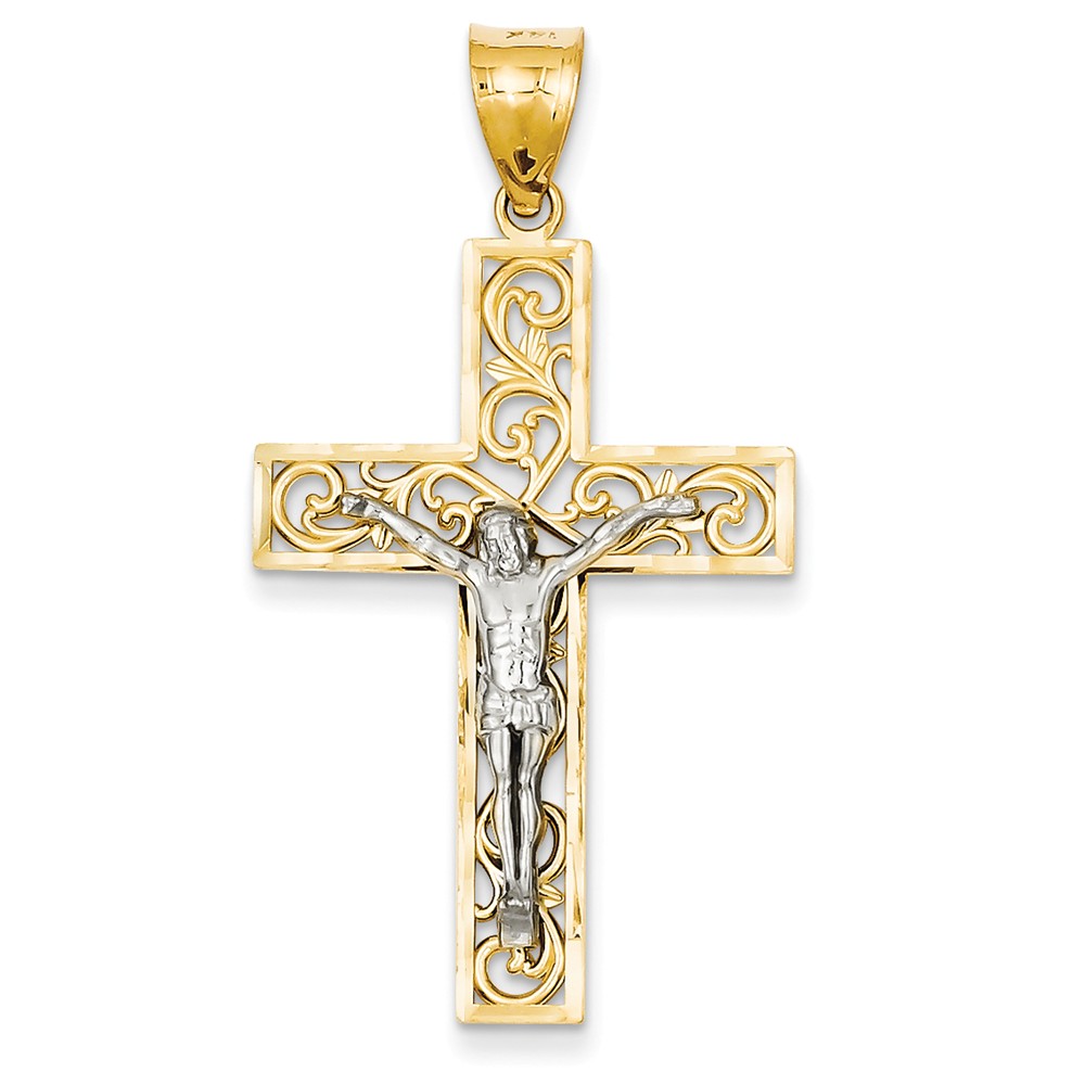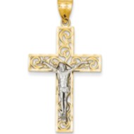 14K Two-tone D/C Large Block Filigree Cross w/Crucifix Pendant
