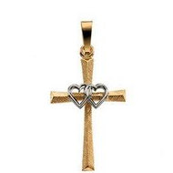 14K TWO TONE GOLD CROSS PENDANT W/DOUBLE HEARTS