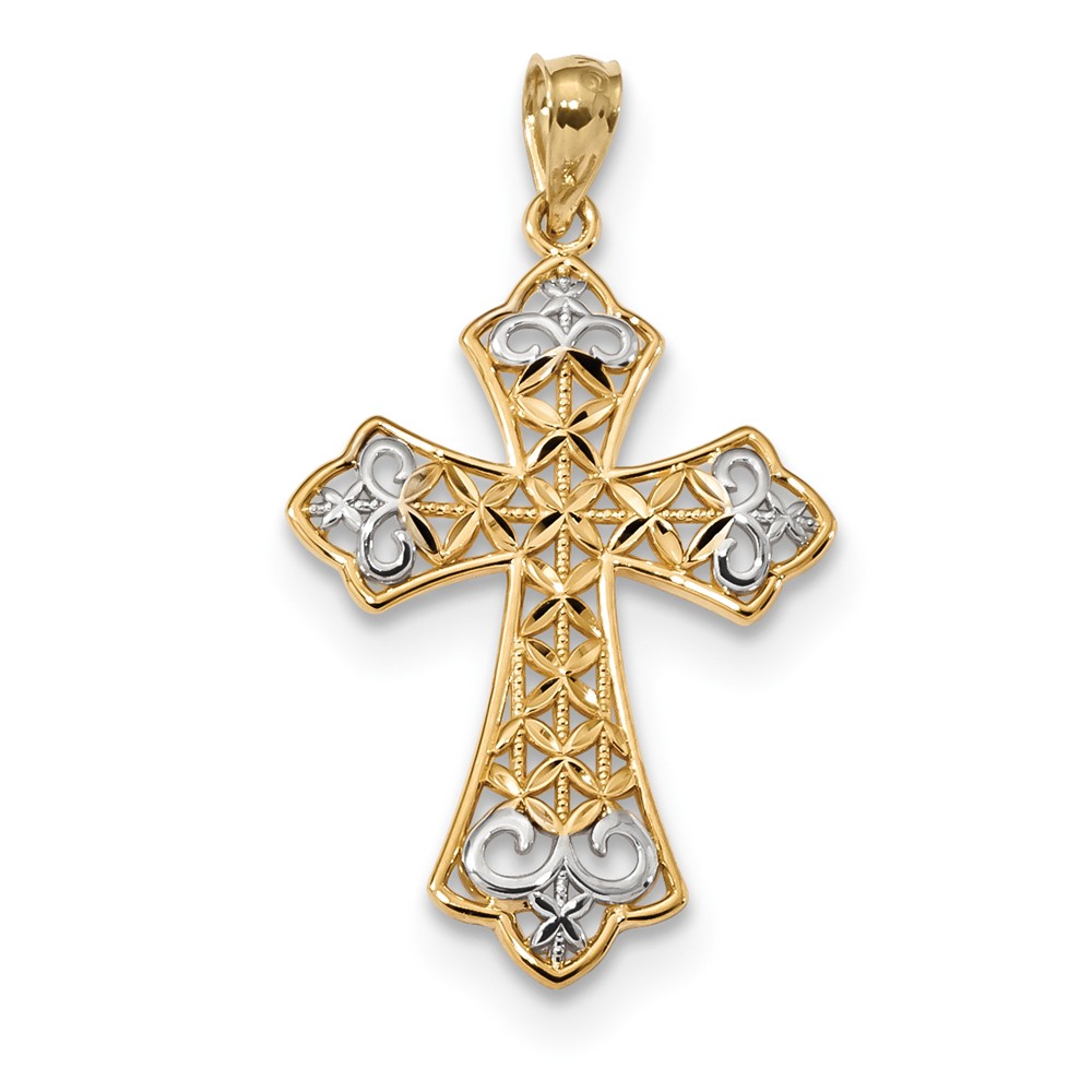 14k w/Rhodium Polished D/C Filigree Cross Pendant