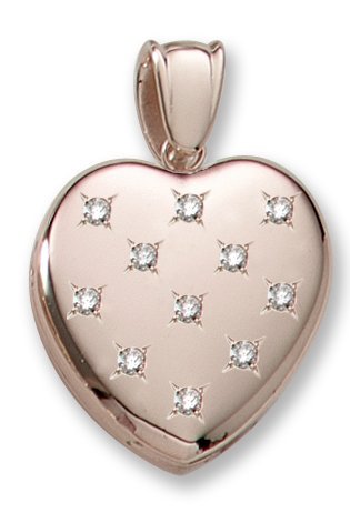 The diamond weight is .22twc (11 stones). The diamonds creatively scattered in the center of this heart shaped locket are stunning clear VS 2, G Color Diamonds.