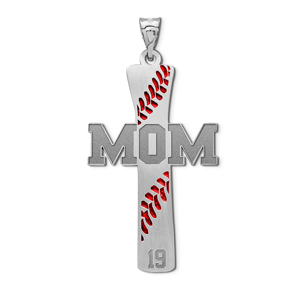 Baseball Stitch Enameled Mom Cross Pendant w/ Number