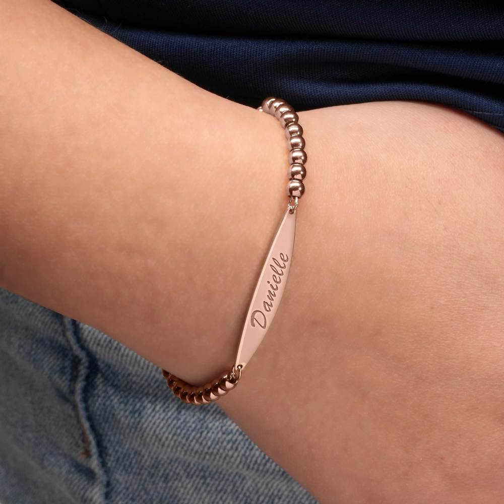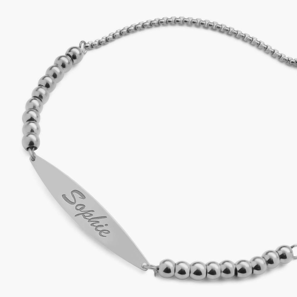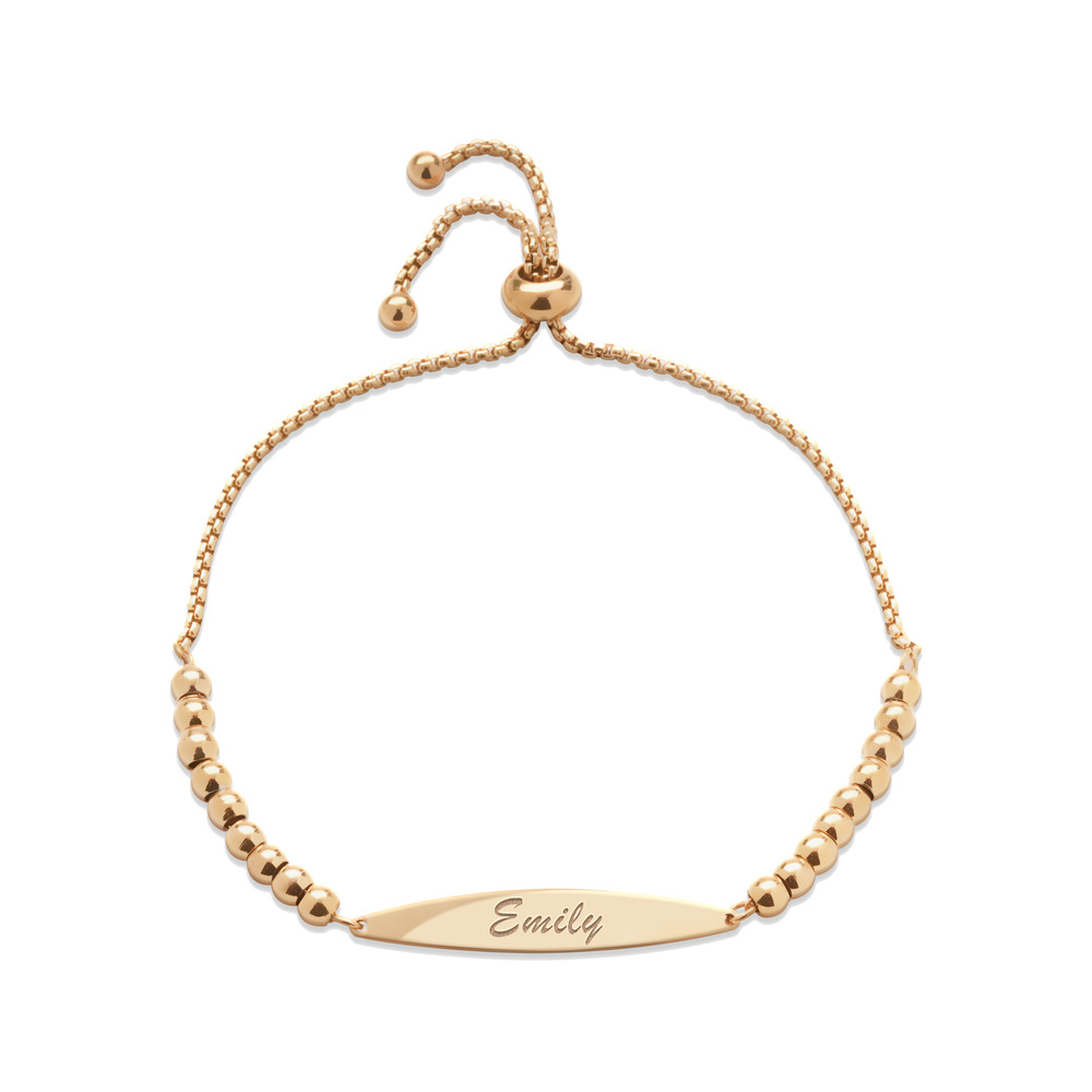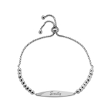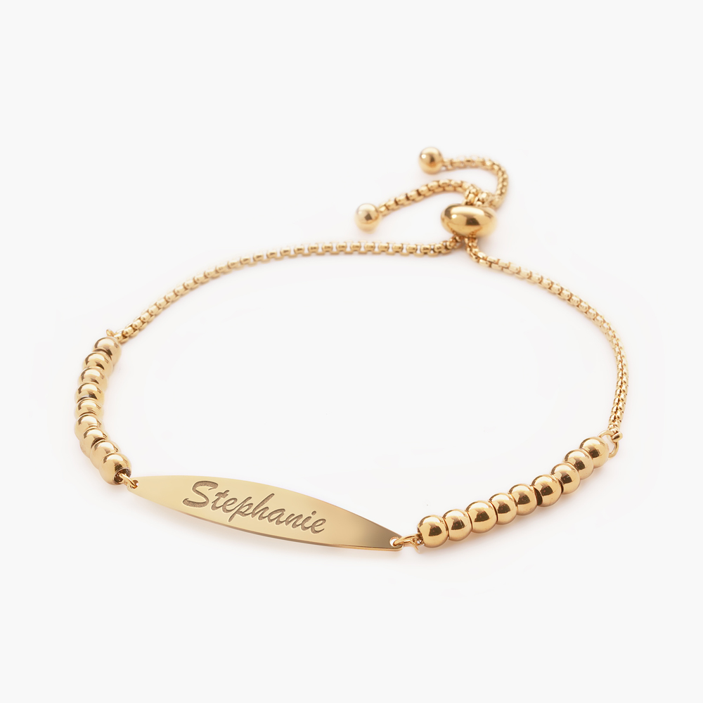delicate beaded design and a polished ID plate, this bracelet can be custom engraved with a name, date, or meaningful