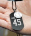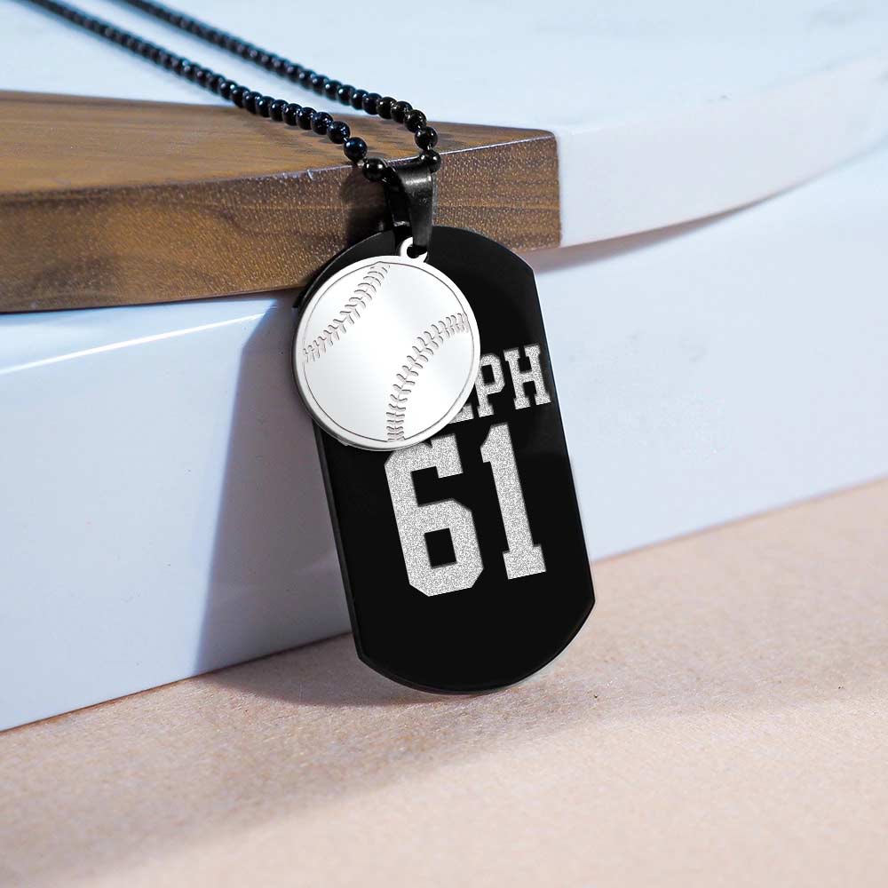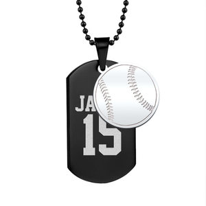 This fashionable necklace is the perfect way to show off your team spirit. Crafted with black stainless steel, the sports name and number dog tag is accompanied by a silver baseball charm, making this the ideal accessory for any die- hard baseball fan. Add a motivational message engraving to the back to cheer on your favorite athlete!