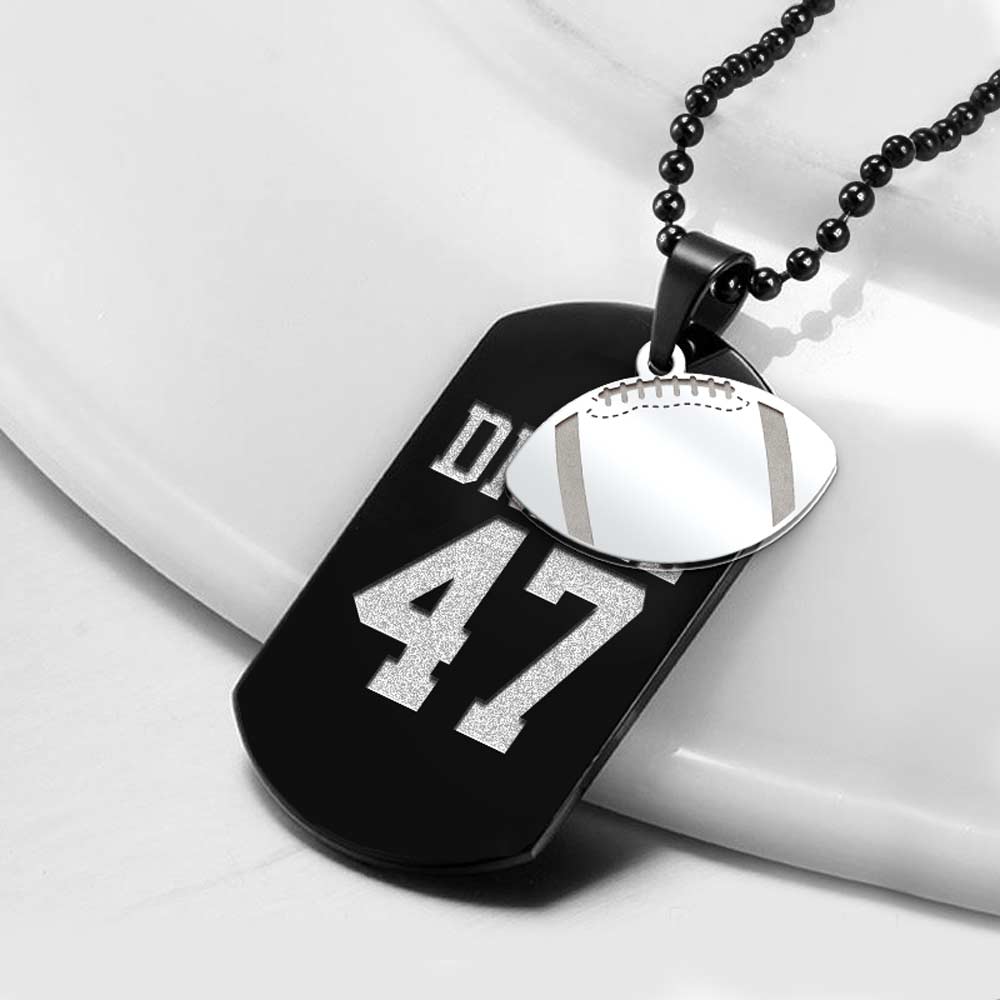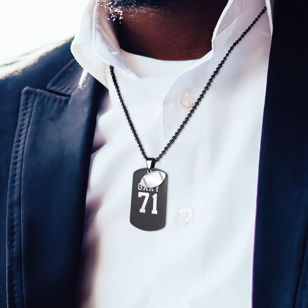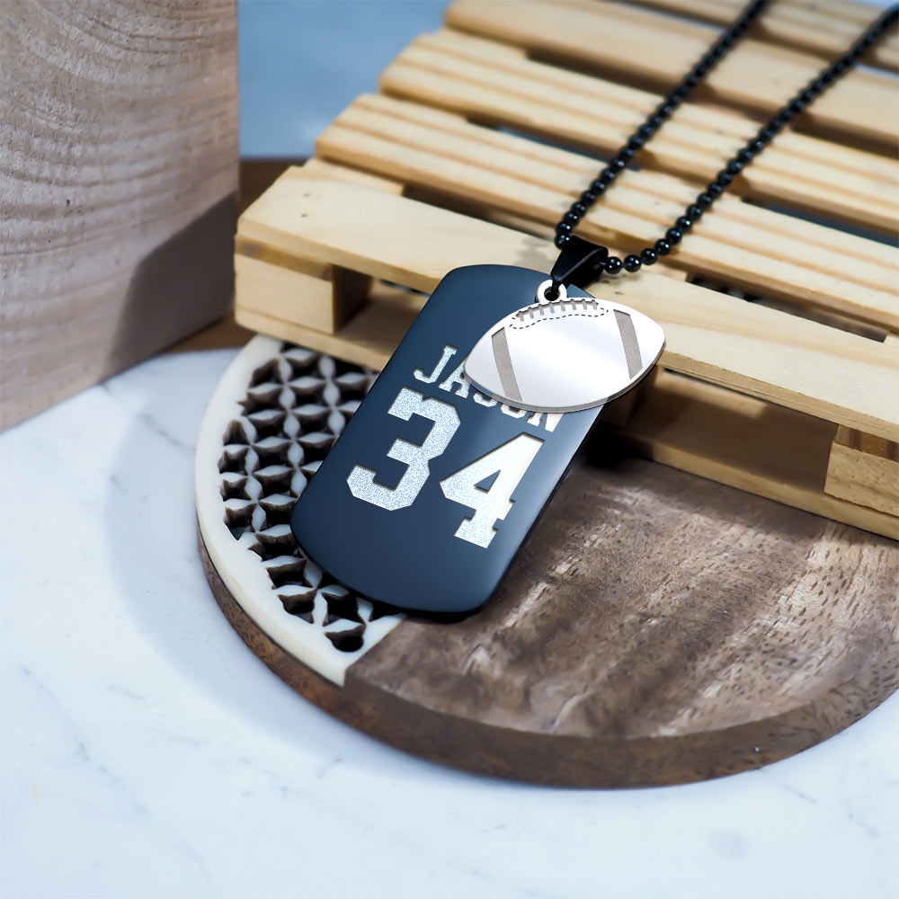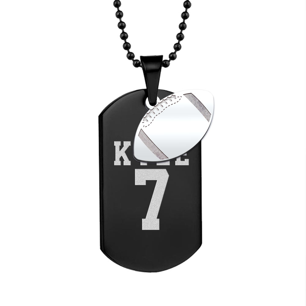 Make a statement with this stylish Black Stainless Steel Sports Name and Number Dog Tag necklace with a Football Charm and show off your team spirit.