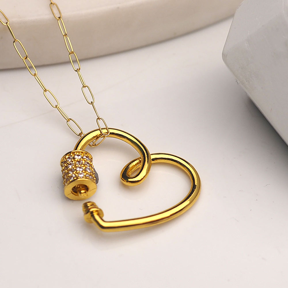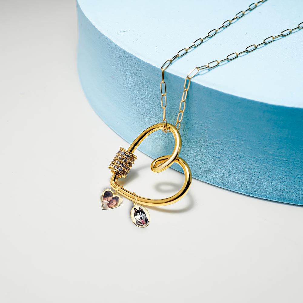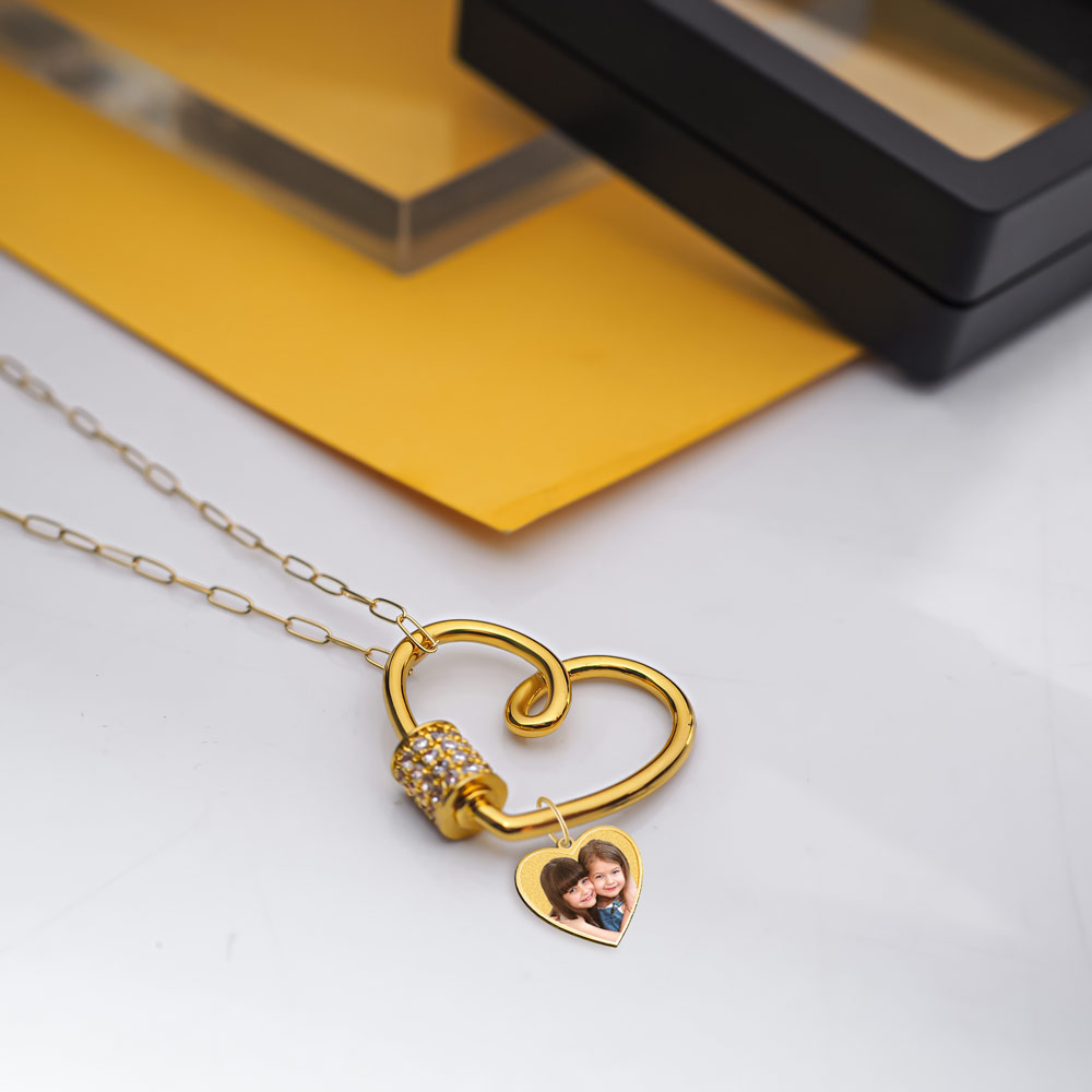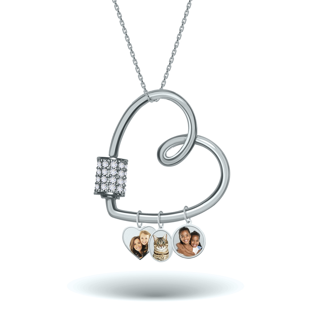 Carabiner Heart Pendant Necklace with CZ Barrel and Dangle Photo Charms / Chain Included