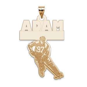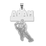 Your custom sports pendant is available in 2 sizes and in 14K Solid Yellow Gold, 14K Solid White Gold, Or Sterling Silver. Most can handle a name, team name, and even the number the players wear.