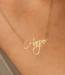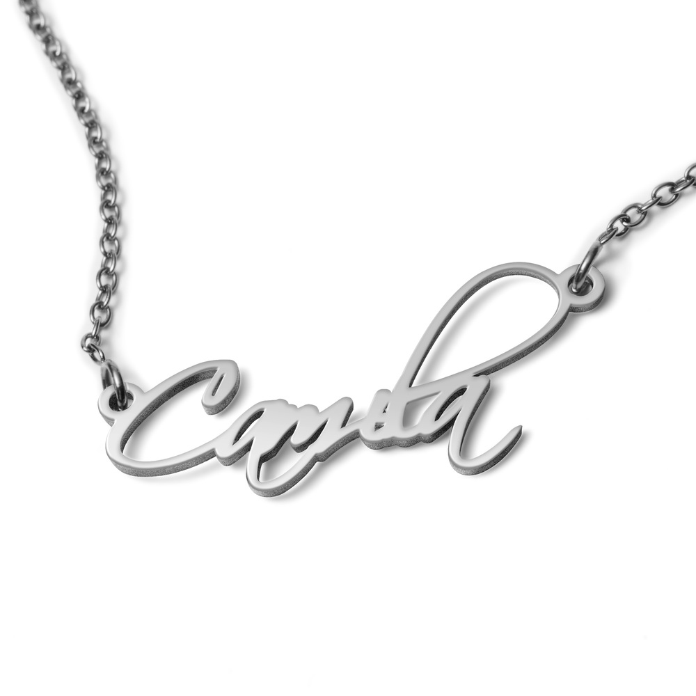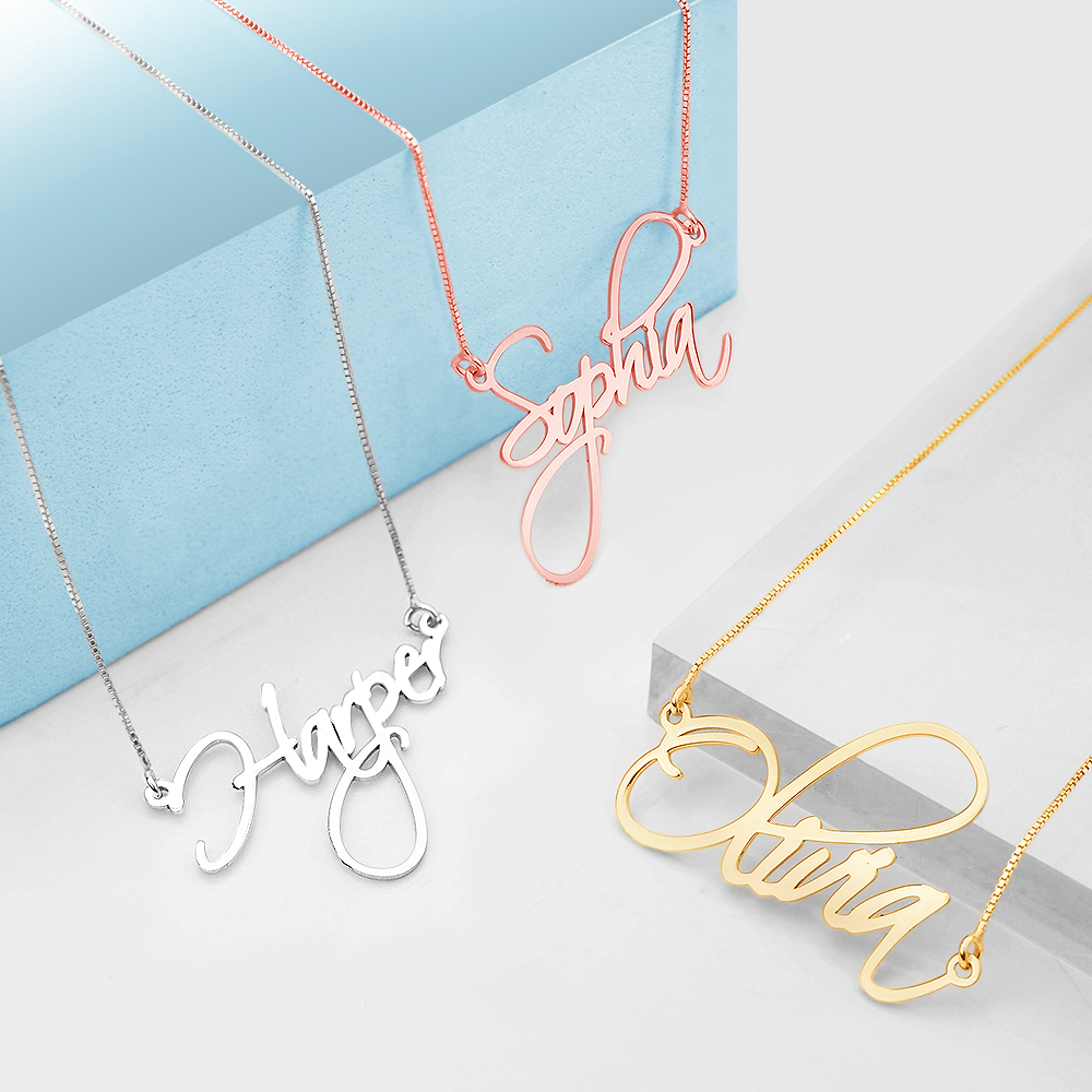 high polished script nameplate is available in Solid .925 Sterling Silver, 14k Gold