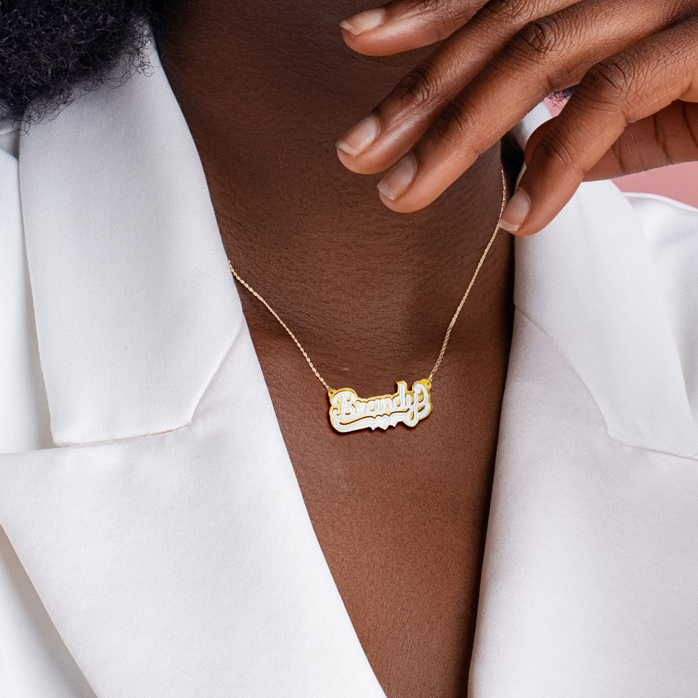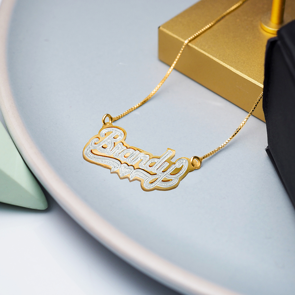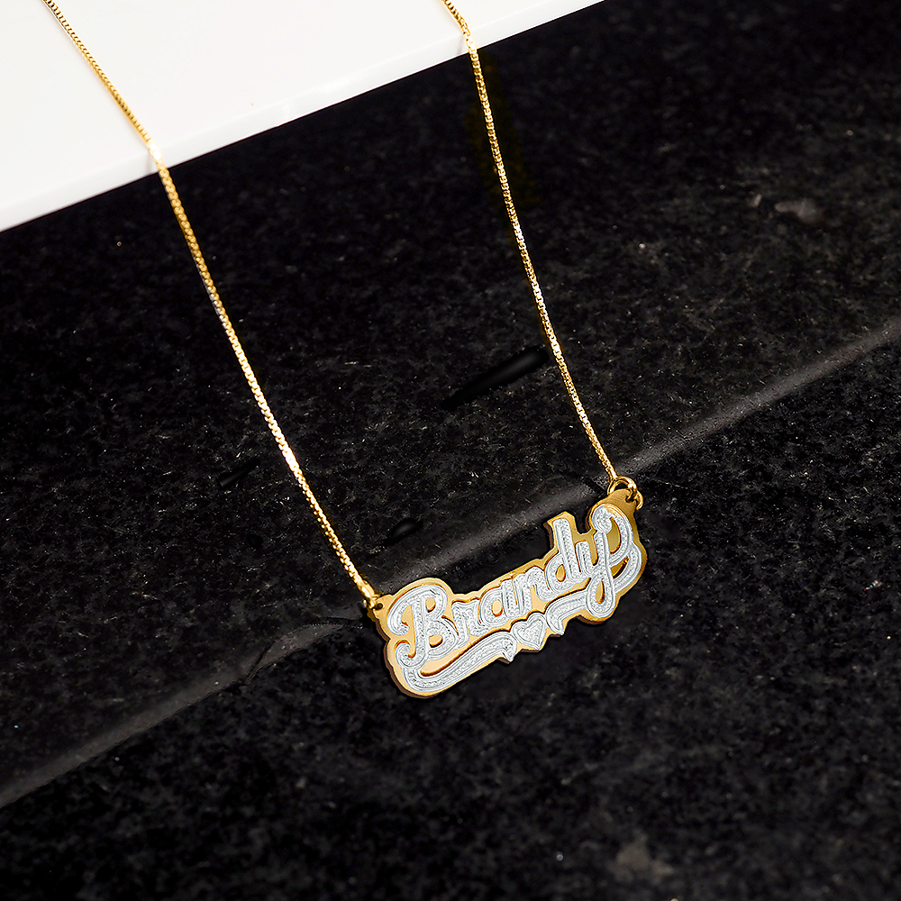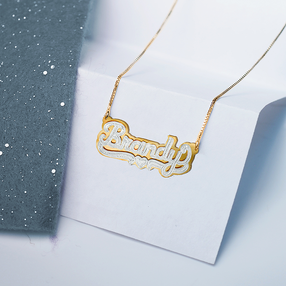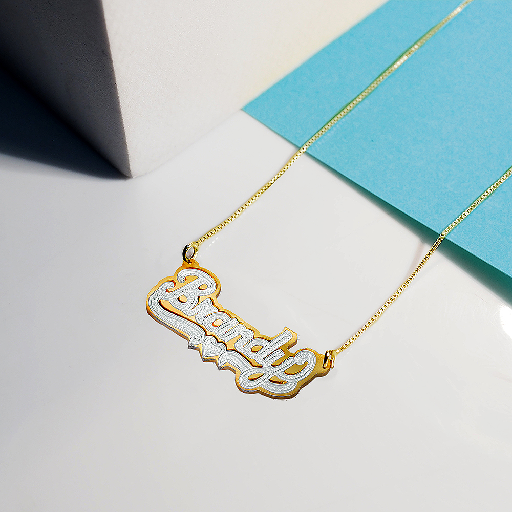 This Classic Diamond Cut Script Name Necklace is available in Solid .925 Sterling Silver, 14K Yellow Gold, 14K White Gold and 14K Two Toned Yellow and White
