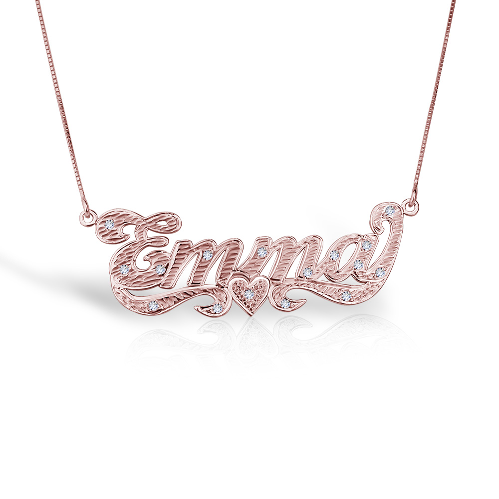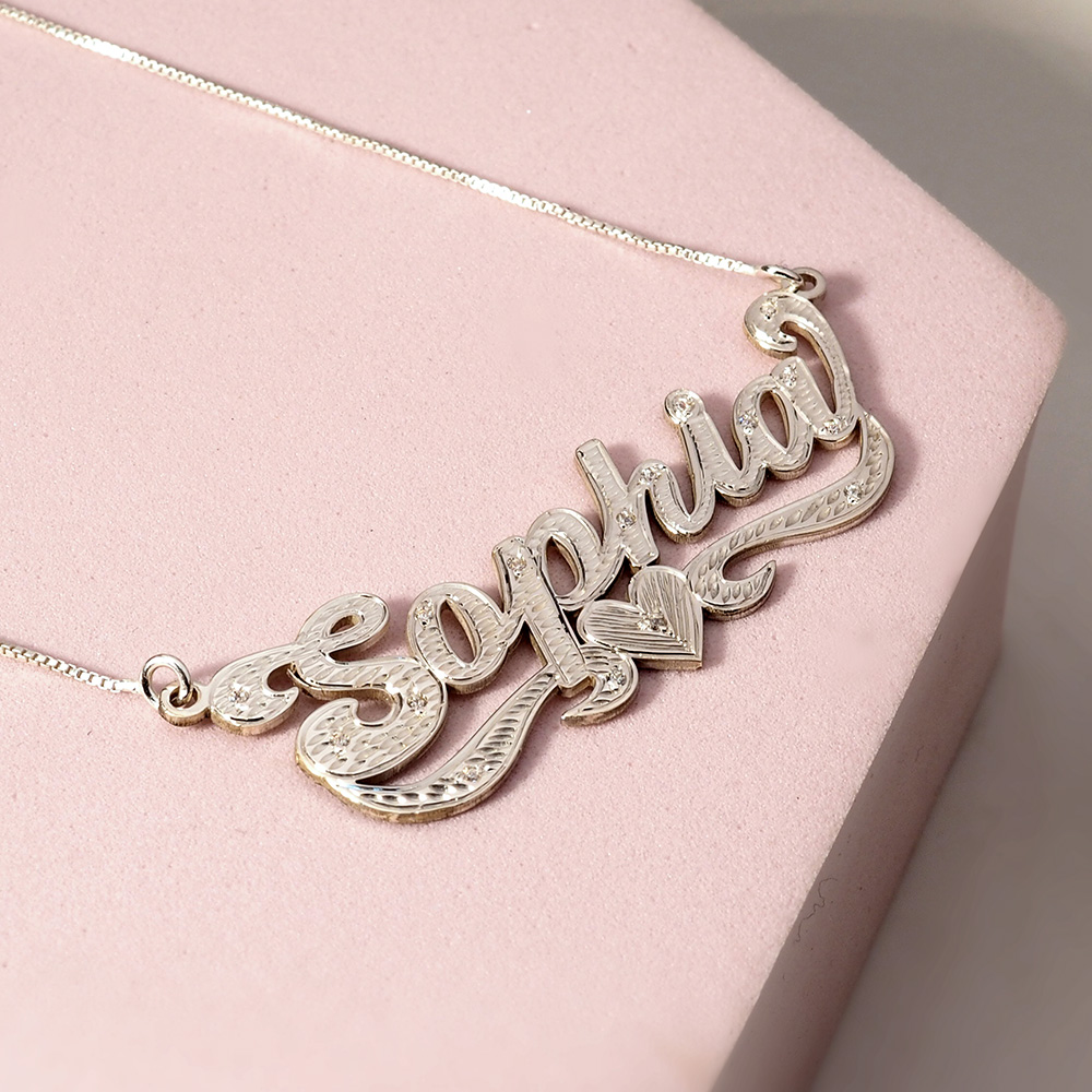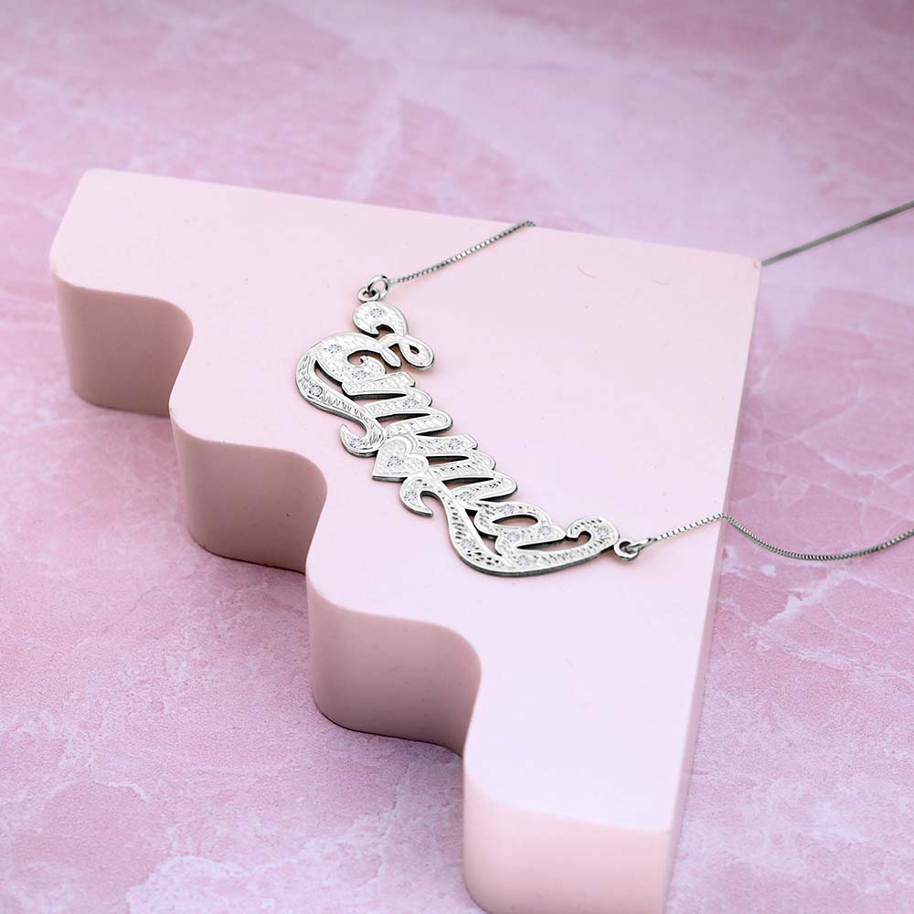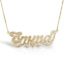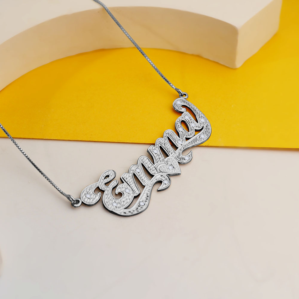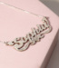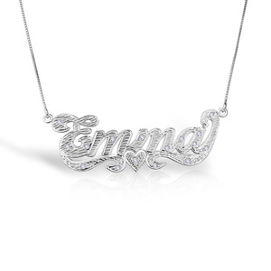 This Diamond Cut Script Name Necklace with Cubic Zirconia is available in Solid .925 Sterling Silver, 14K Gold