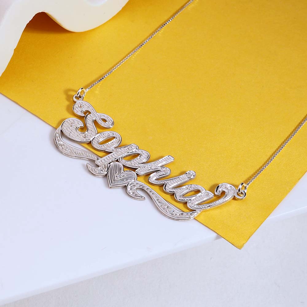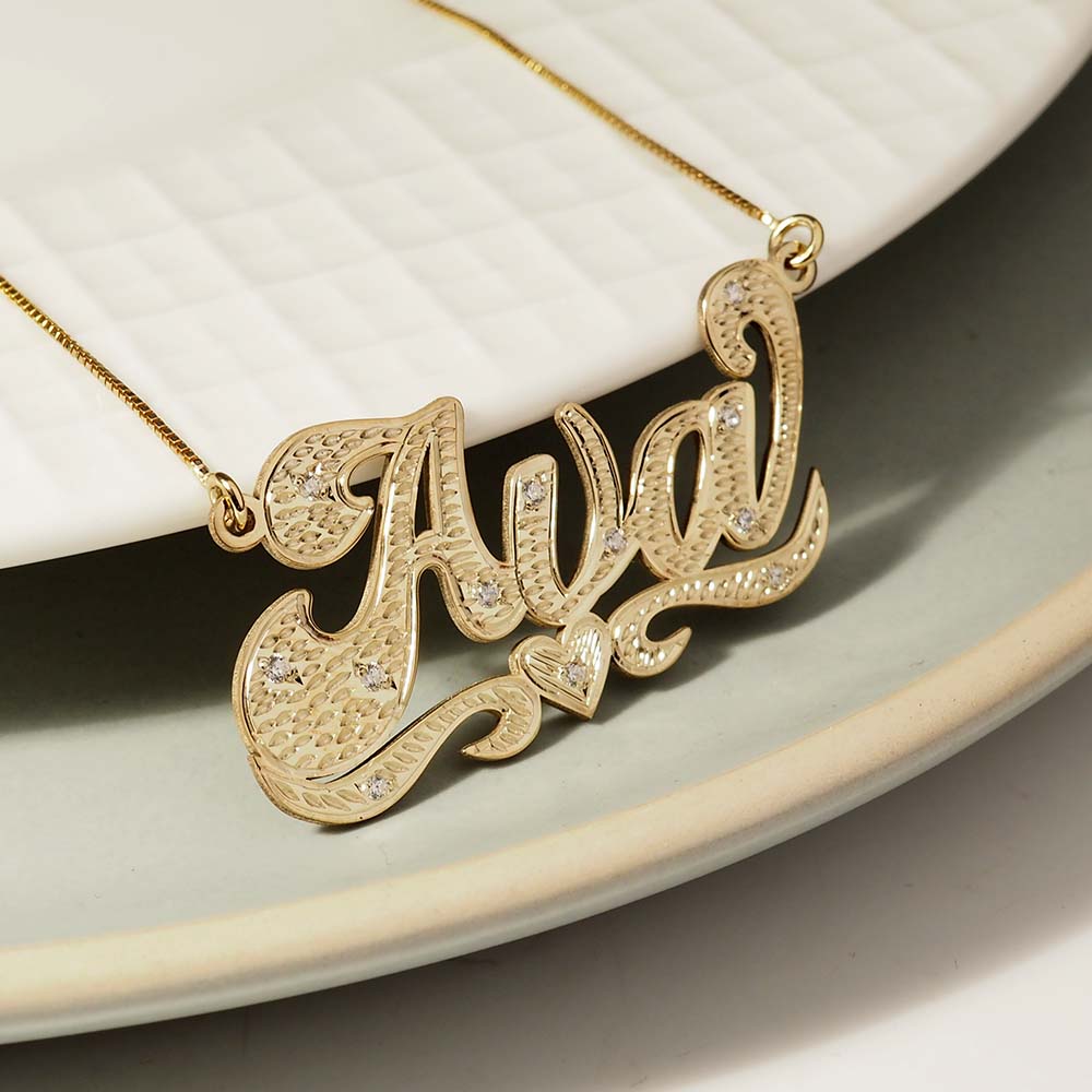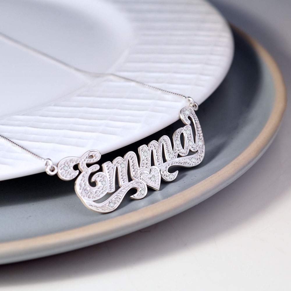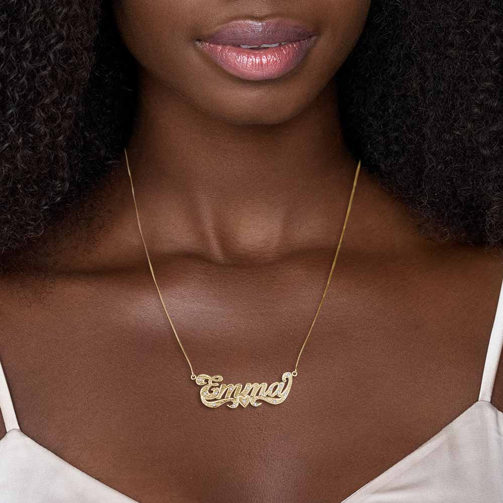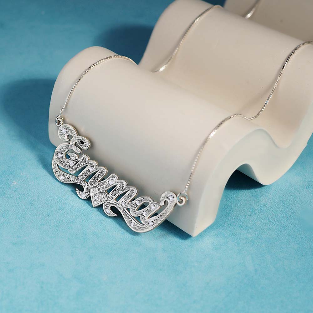 This Diamond Cut Script Name Necklace with Cubic Zirconia is available in Solid .925 Sterling Silver, 14K Gold