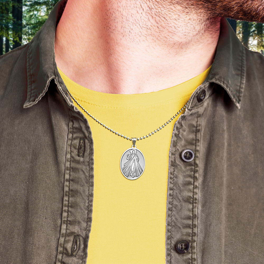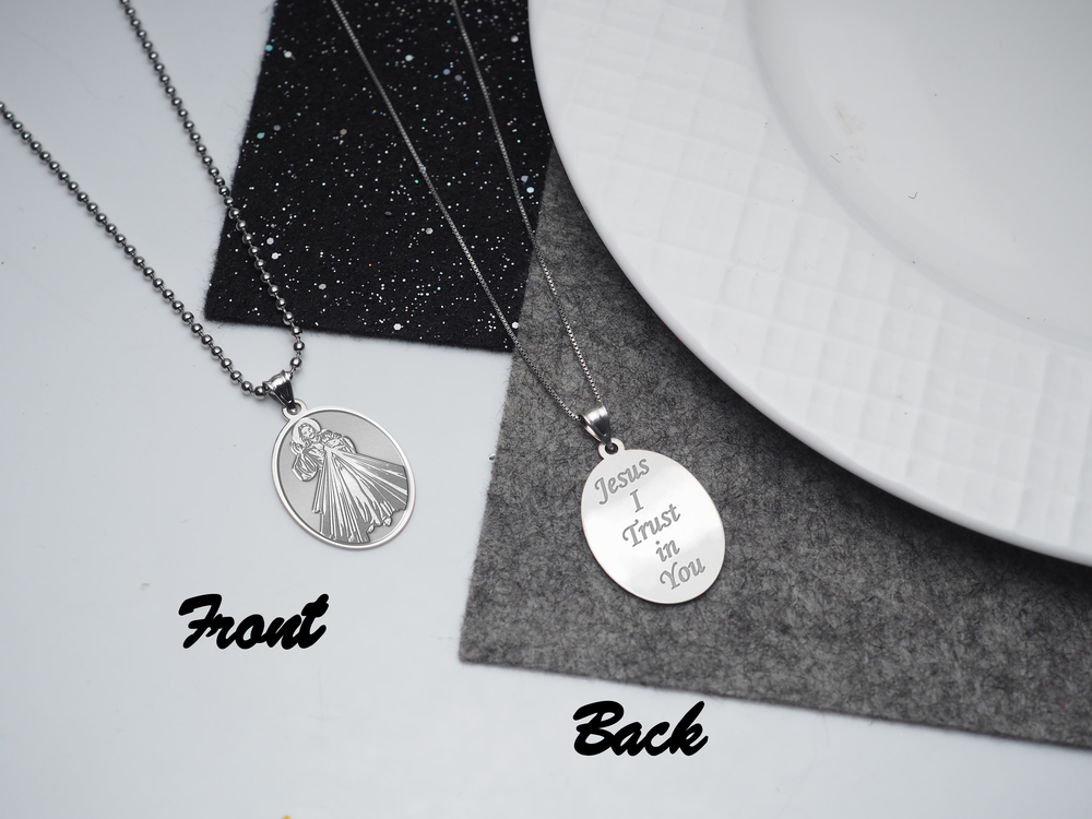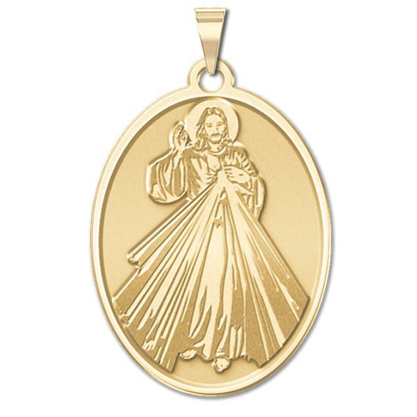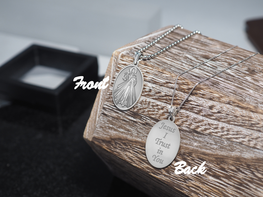 The front of the medal features the lord Jesus Christ and the back inscribes the words "Jesus I Trust In You." The Divine Mercy is a Christian devotion focused on the mercy of God and its power, particularly as a form of thanksgiving and entrusting of oneself to God's mercy. The devotion as known today can be traced to Polish nun and canonized saint, Sister Faustyna Kowalska, known as the "Apostle of Mercy", who lived from 1905-1938. It is known that anyone who seeks God's mercy will not be turned away (Matthew 7:7). "Jesus I Trust In You" are the words inscribed on a picture that Faustina had said was to be made at the request of Jesus himself through the inner speakings of the Lord to Faustina. In 2000, Pope John Paul II officially instituted the Feast of the Divine Mercy universally for the Catholic Church on the same day that he also canonized St. Faustina.