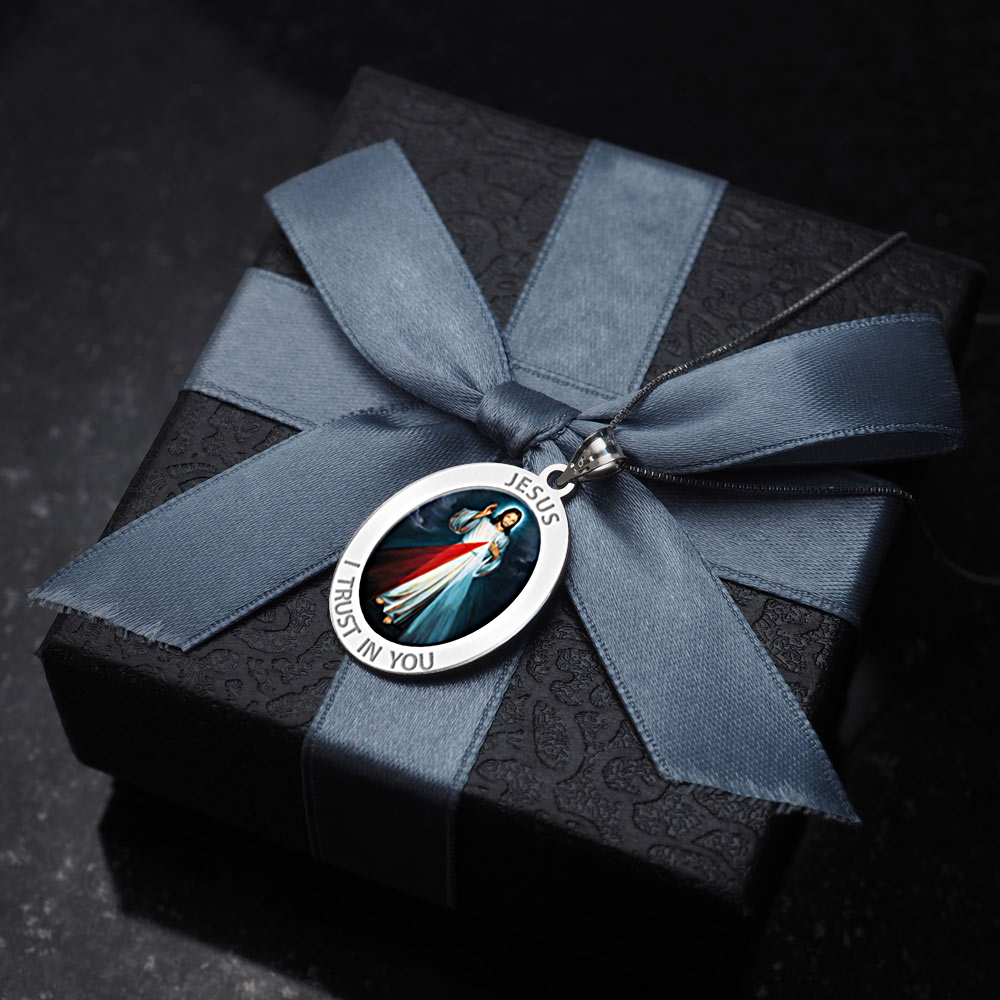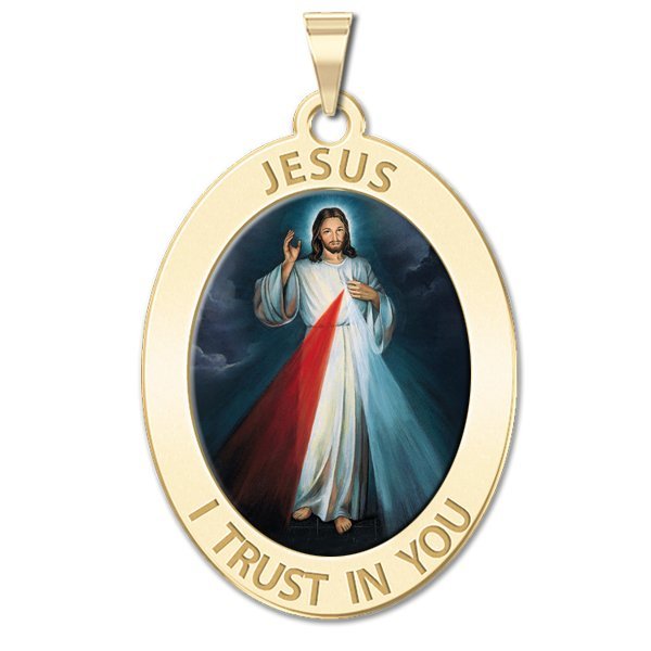The front of the medal features the lord Jesus Christ and the back inscribes the words "Jesus I Trust In You."