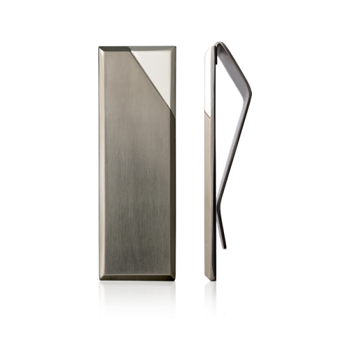 Iconic faceted money clip in polished and brushed stainless steel with cutaway corner design.
