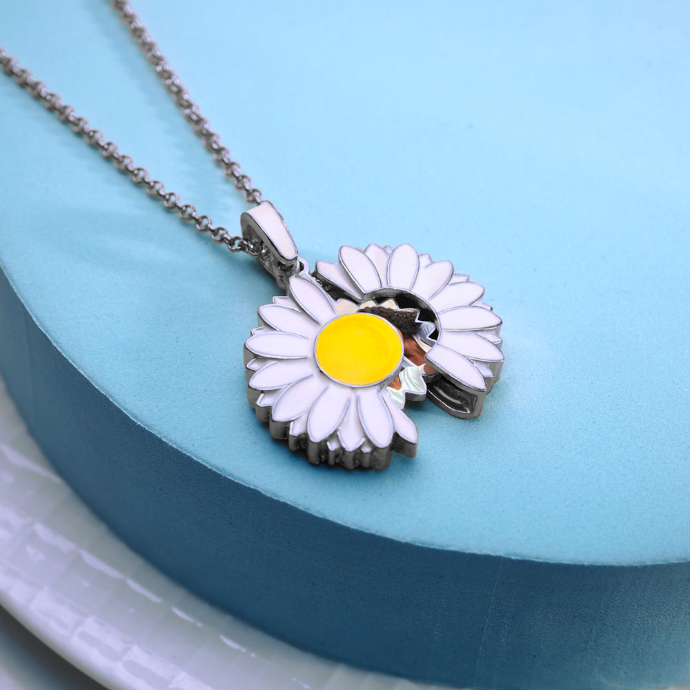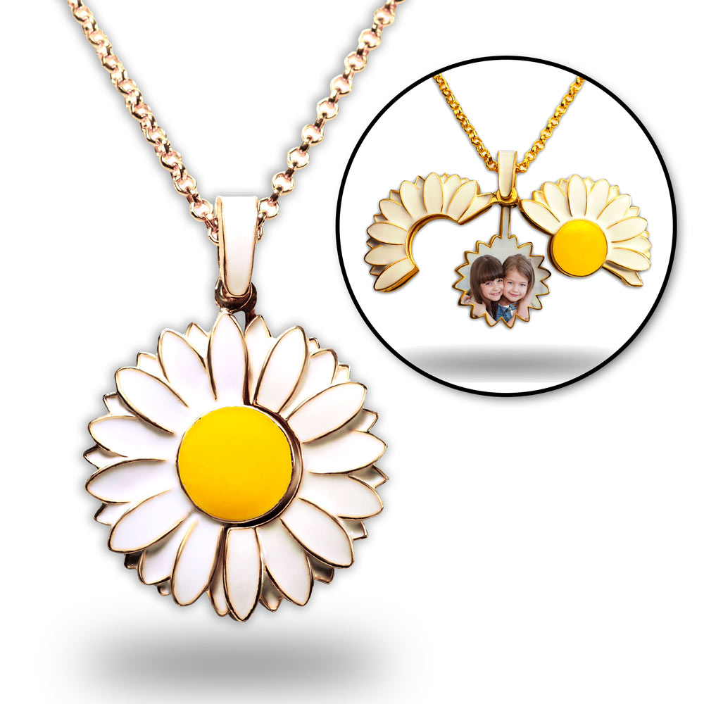 This beautiful Enameled Daisy Photo Necklace is the perfect gift for Mom, Sister, Aunt, or your Best Friend. This pendant closed shows off the vibrant colors of white and yellow of a Daisy on the front and back. When you open the Daisy, inside will appear a charm that can hold a photo and engraving.