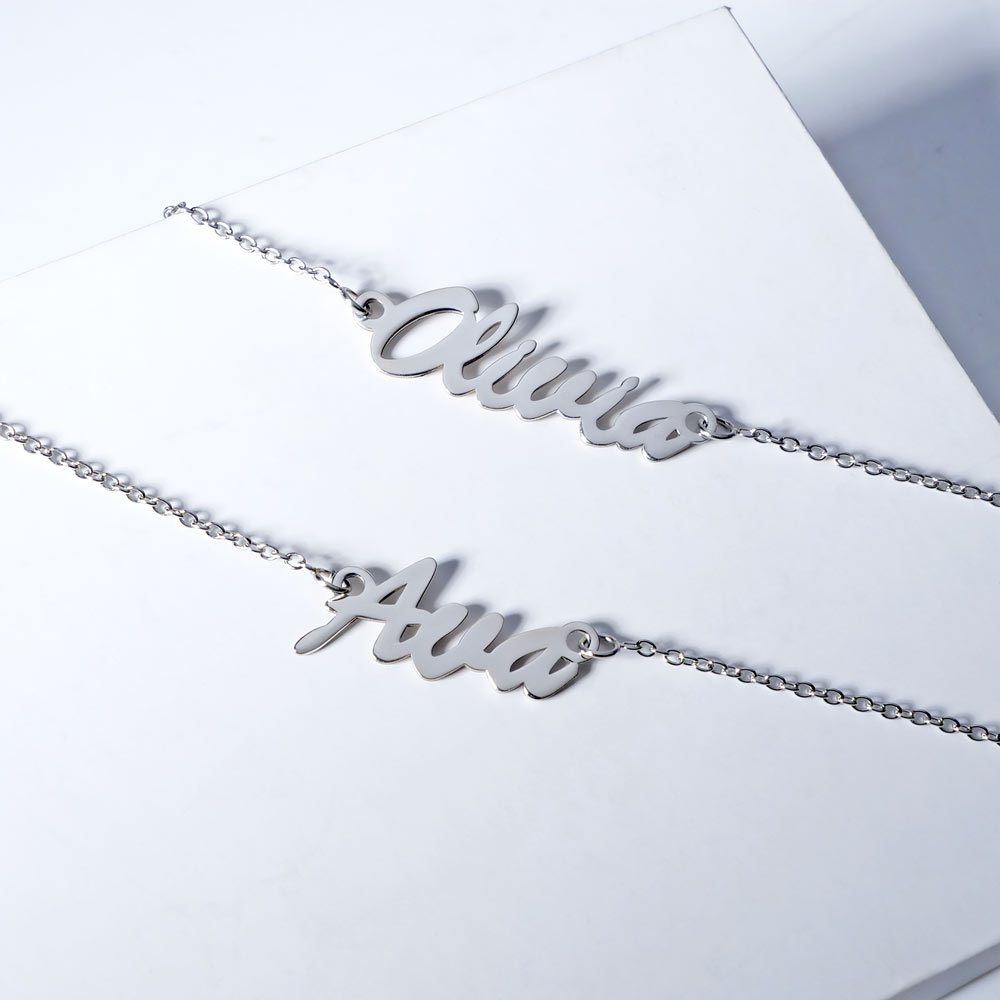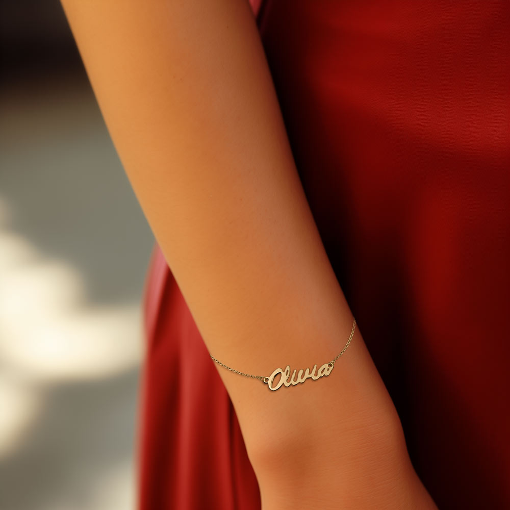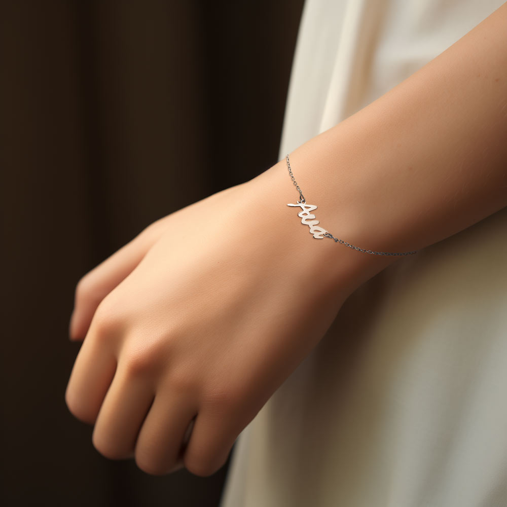 Introducing our Personalized Modern Script Name Bracelet, a stunning accessory that combines elegance and individuality. This exquisite bracelet features a delicate design with the name or word of your choice in modern script. Created with attention to detail, this bracelet is made to order, allowing you to personalize it with your own name or a special word that holds meaning to you. The metal finish adds a touch of luxury, making it a perfect statement piece for any occasion. Whether you want to treat yourself or surprise a loved one with a unique gift, our Personalized Modern Script Name Bracelet is a timeless choice that will be cherished for years to come. Embrace your personal style and make a statement with this elegant and meaningful accessory.
