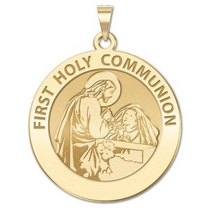 The Sacrament of the Body and Blood of Jesus. This 14K Solid Gold medal celebrates receiving Jesus for the first time. This design is made specially for a girl receiving communion.