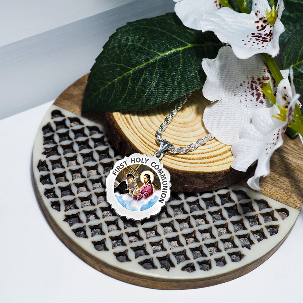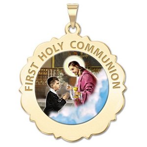 First Holy Communion Scalloped Round Religious Medal (Boy) "Color EXCLUSIVE"