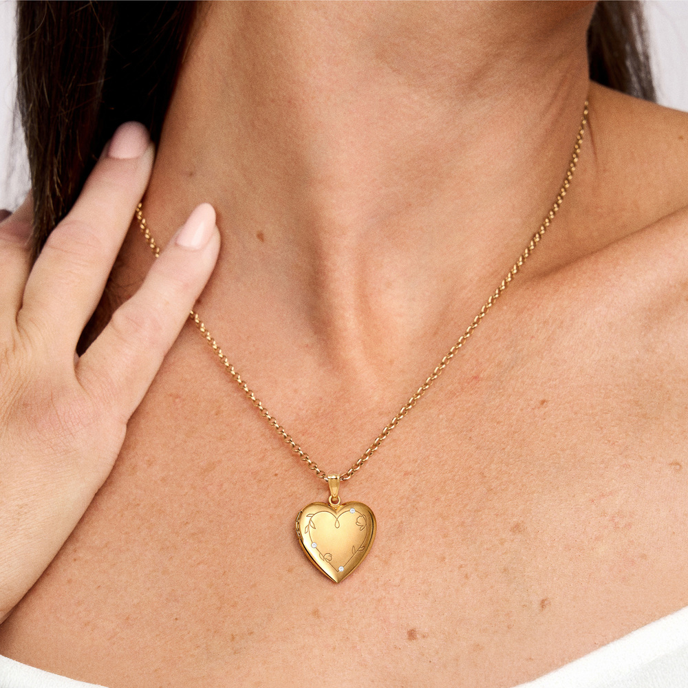 Keep your most treasured memories close with this elegant Floral Engraved Heart Locket with Diamond Accents. The timeless heart-shaped design features delicate floral engravings that add a romantic and vintage-inspired touch.