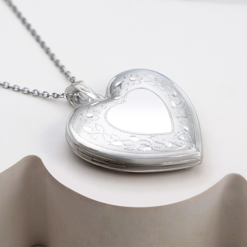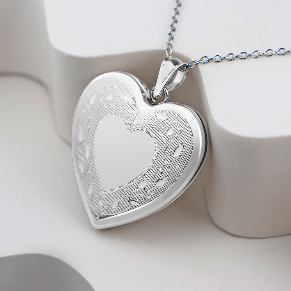 This exquisite sterling silver locket features a beautifully crafted floral heart border design, combining timeless elegance with sentimental charm. The locket opens to reveal space for photos or a small keepsake, making it the perfect piece to hold cherished memories close to your heart. Its intricate detailing and polished finish make this locket a meaningful gift or a treasured addition to any jewelry collection.