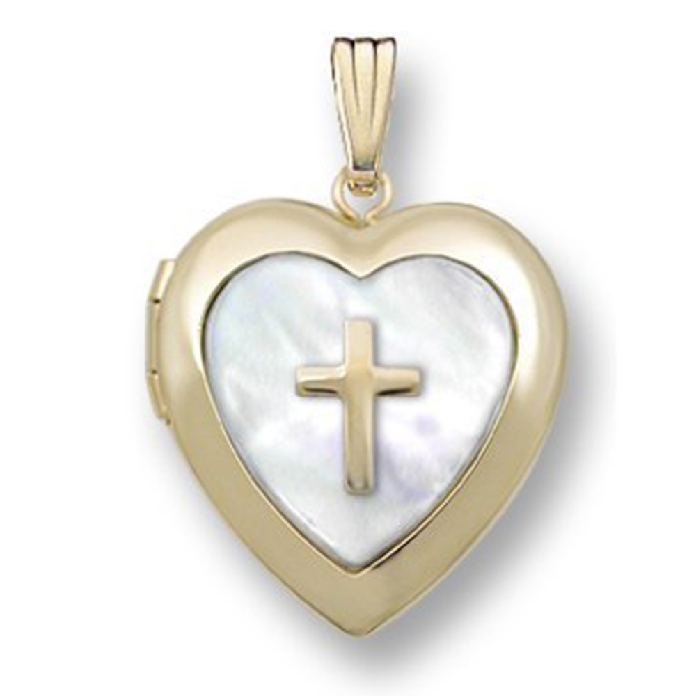 14k Gold Filled Mother of Pearl Cross Heart Photo Locket