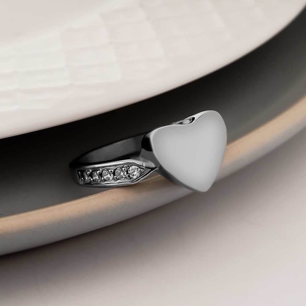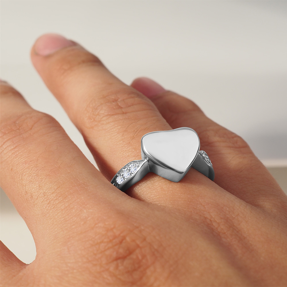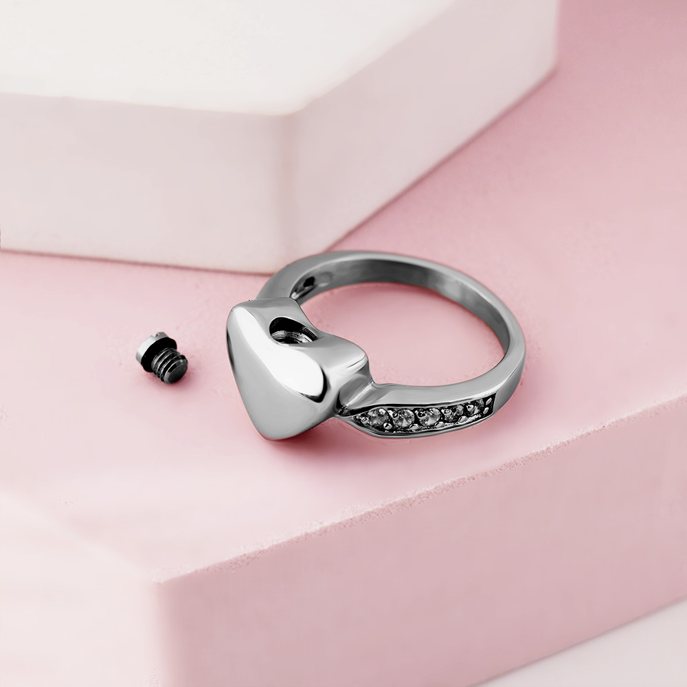 This Cremation Heart Ring with CZ's on the side of the ring band is the perfect way to keep your loved one with you at all