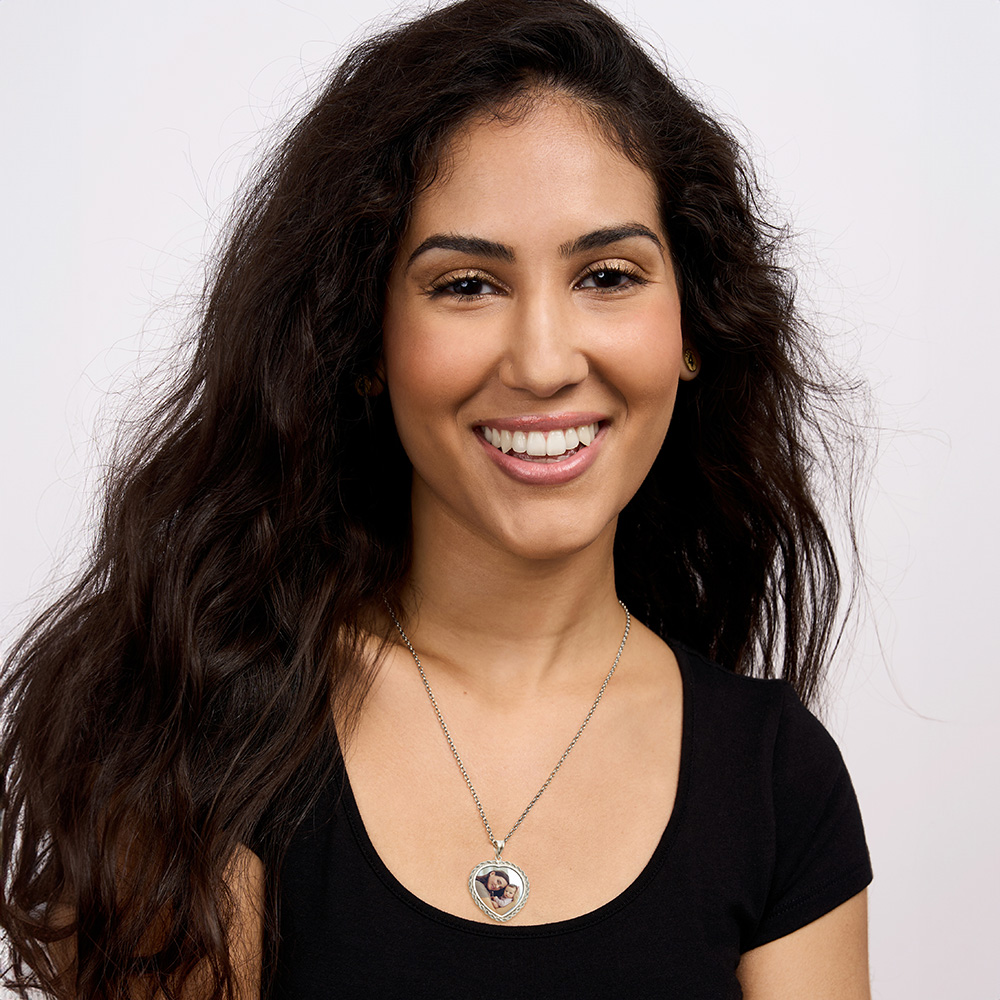 Q: Is it possible to use a picture with a space between the two people in the photo? Also, is it possible to engrave something on the other side of the pendant, for example, a cross... Thank you.