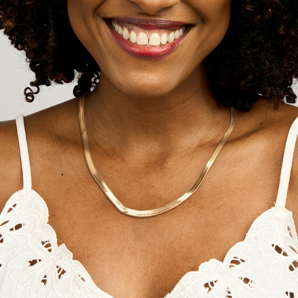 Add a touch of timeless elegance to your jewelry collection with this stunning Herringbone Chain. Known for its sleek, fluid design, the herringbone pattern creates a smooth, cascading effect that drapes beautifully around the neck. This versatile piece is perfect for layering with other necklaces or wearing on its own as a statement piece. Crafted with precision and attention to detail, this chain is a must-have for anyone who appreciates classic, sophisticated style. Whether you're dressing up for a special occasion or adding a refined touch to your everyday look, the Herringbone Chain is the perfect accessory to elevate your ensemble.