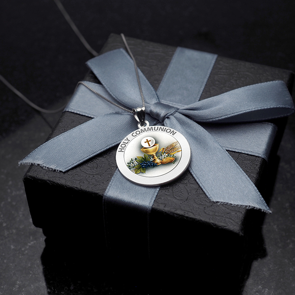 The Sacrament of the Body and Blood of Jesus. This 14K Solid Gold medal celebrates receiving Jesus for the first time. This design is made specially for a girl receiving communion.