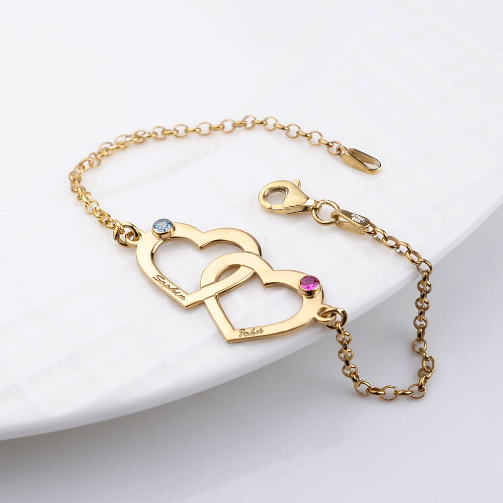 Held together by a rounded box chain, with a interlocking heart in the center, personalized with any name or words of