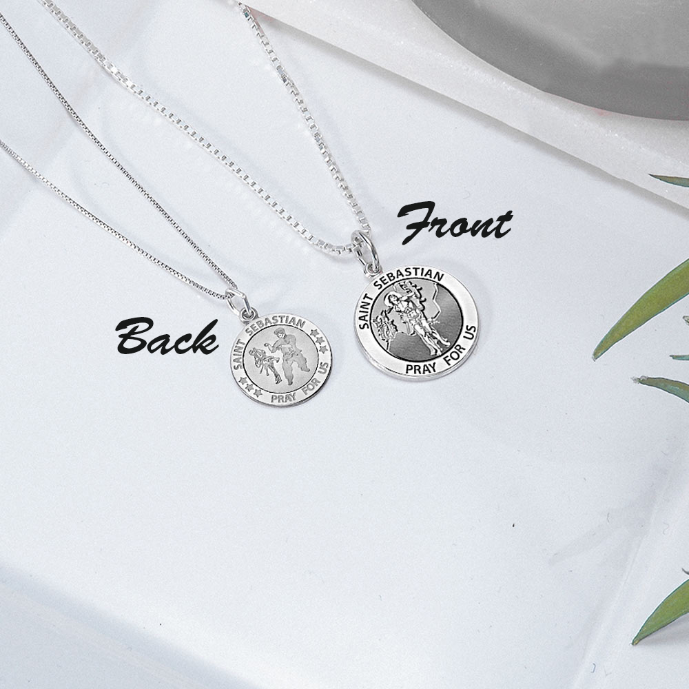 Saint Sebastian was a Christian saint and martyr, who is said to have been killed while the Roman emperor Diocletian engaged in the persecution of Christians in the 3rd century. He is commonly depicted in art and literature tied to a post and shot with arrows just like on this medal. He is patron saint to Soldiers, plagues, arrows, athletes and unofficially youth.