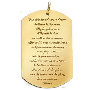 Item is available in Solid Sterling Silver, 14k Yellow Gold or 14k White Gold. Dog Tag Measures 1 1/4 Inch x 2 Inches, Which is a size of an actual Military Dog Tag. The Lord's Prayer, also known as the Our Father or Pater noster, is perhaps the best-known prayer in Christianity. Two versions of it occur in the New Testament, one in the Gospel of Matthew 6:913 as part of the discourse on ostentation, a section of the Sermon on the Mount; and the other in the Gospel of Luke 11:24. The context of the prayer in Matthew is as part of a discourse deploring people who pray simply for the purpose of being seen to pray; Matthew describes Jesus as instructing people to pray "after the manner" of this prayer. Taking into account the prayer's structure, flow of subject matter and emphases, one interpretation of the Lord's Prayer is as a guideline on how to pray rather than something to be learned and repeated by rote.