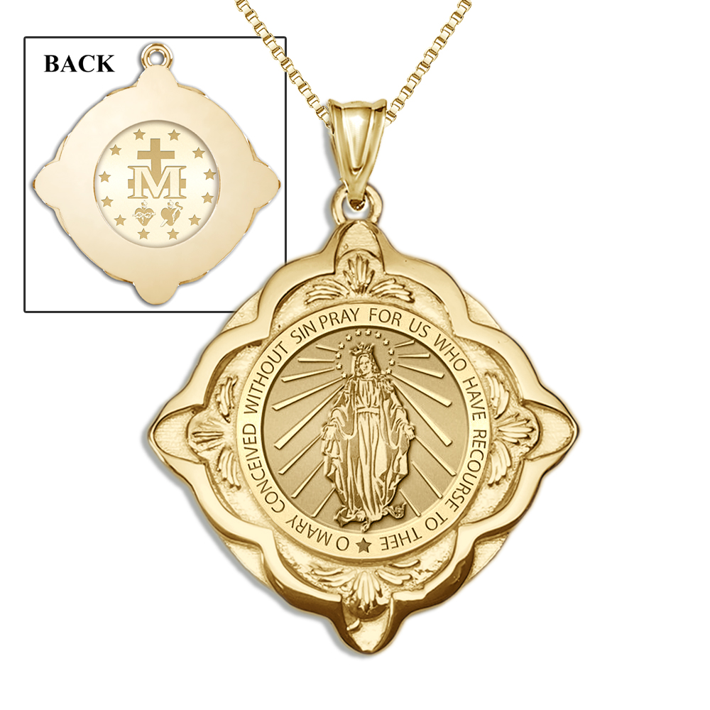 "I've purchased two Miraculous Medals from you at different times. Both times I've been highly satisfied. They came when expected and there were no hidden costs. Actually look so much better than pictures on site. No photo does jewelry any justice. The recent one I got was in sterling silver. I bought it for a friend for Mothers Day as she keeps admiring the one I always wear. Won't she be surprised. Thank you for your meticulous work in creating this fine jewelry."