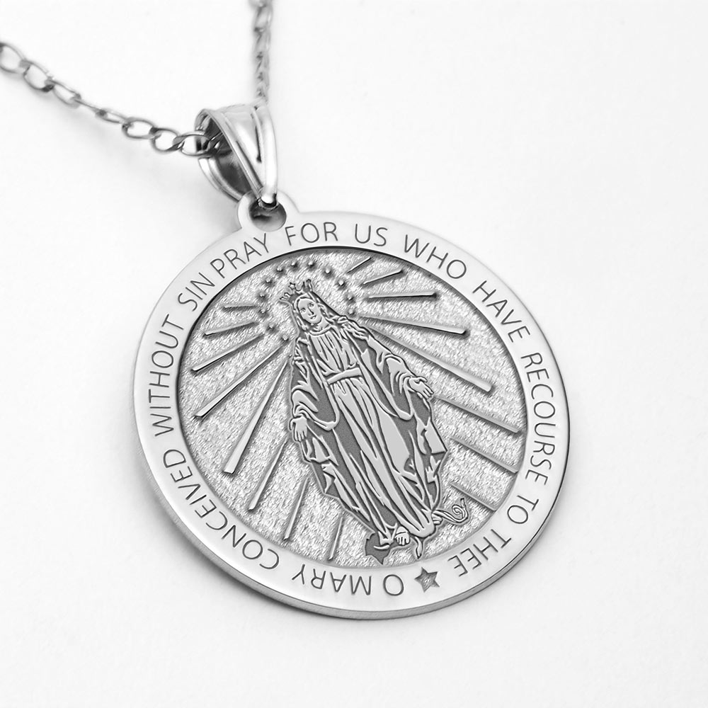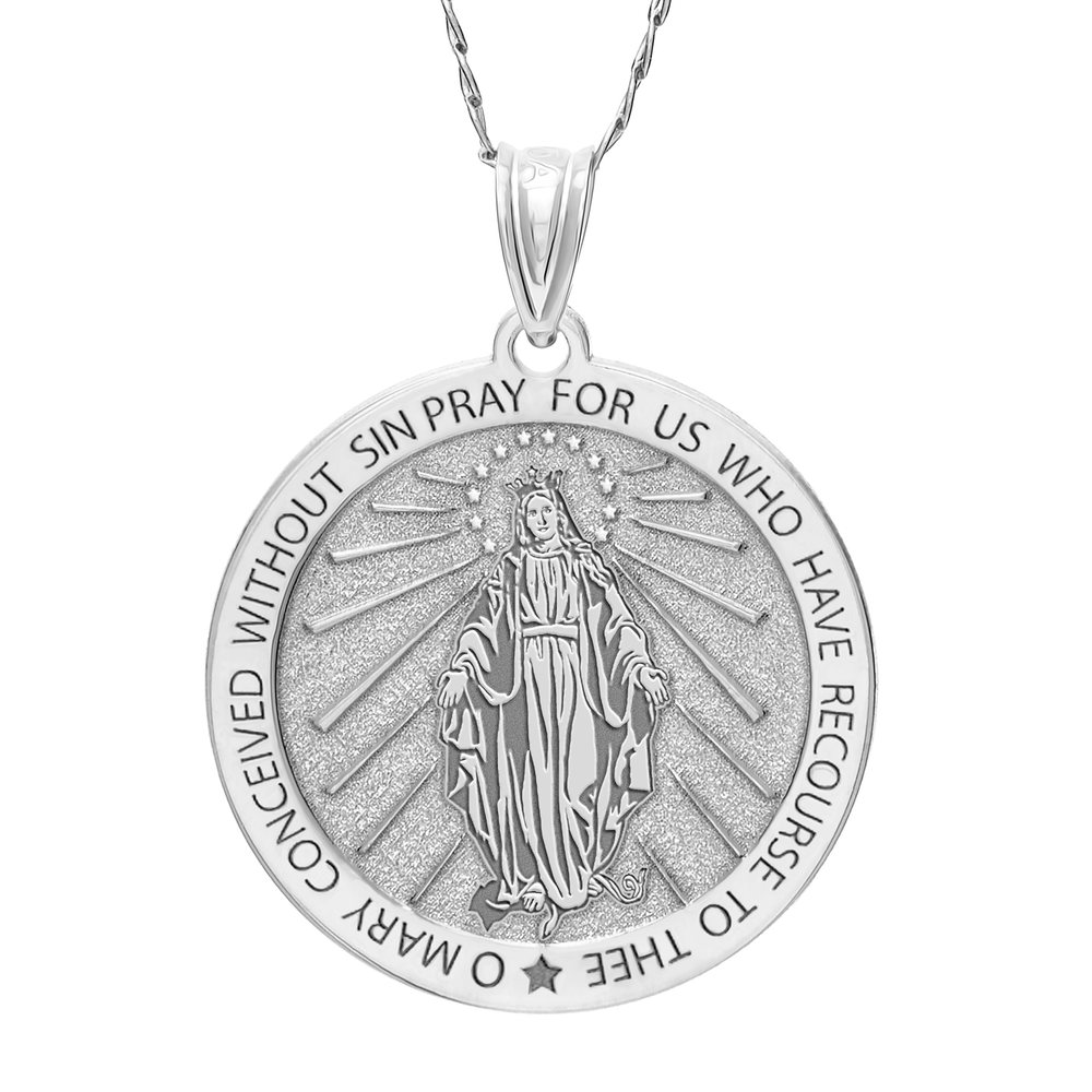 "I've purchased two Miraculous Medals from you at different times. Both times I've been highly satisfied. They came when expected and there were no hidden costs. Actually look so much better than pictures on site. No photo does jewelry any justice. The recent one I got was in sterling silver. I bought it for a friend for Mothers Day as she keeps admiring the one I always wear. Won't she be surprised. Thank you for your meticulous work in creating this fine jewelry."