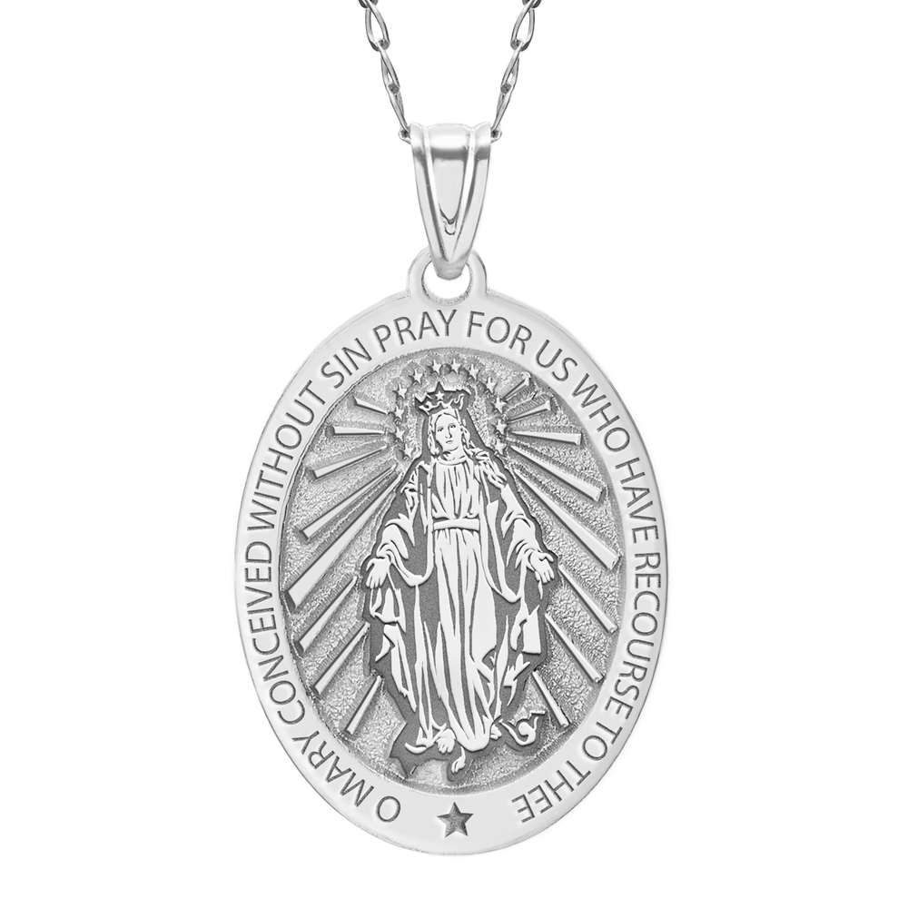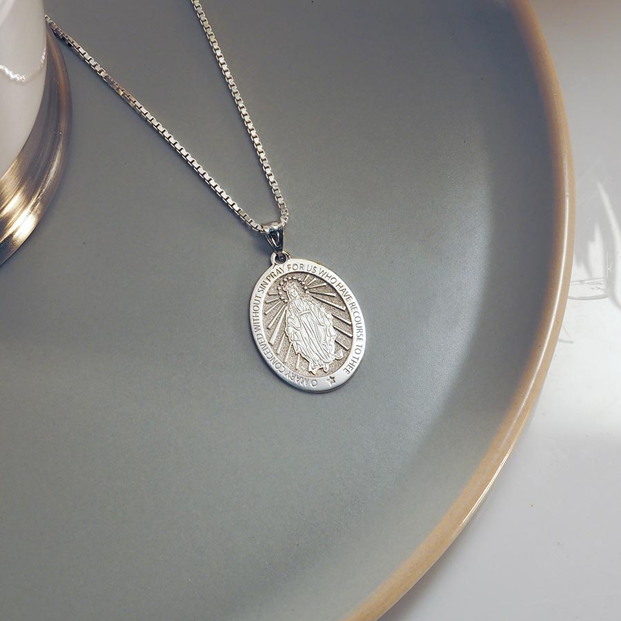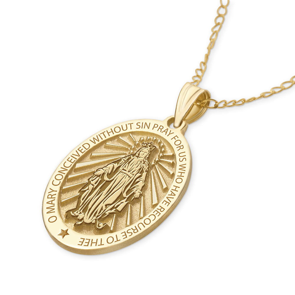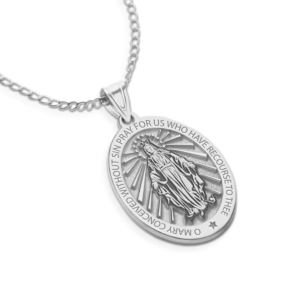 "I've purchased two Miraculous Medals from you at different times. Both times I've been highly satisfied. They came when expected and there were no hidden costs. Actually look so much better than pictures on site. No photo does jewelry any justice. The recent one I got was in sterling silver. I bought it for a friend for Mothers Day as she keeps admiring the one I always wear. Won't she be surprised. Thank you for your meticulous work in creating this fine jewelry."