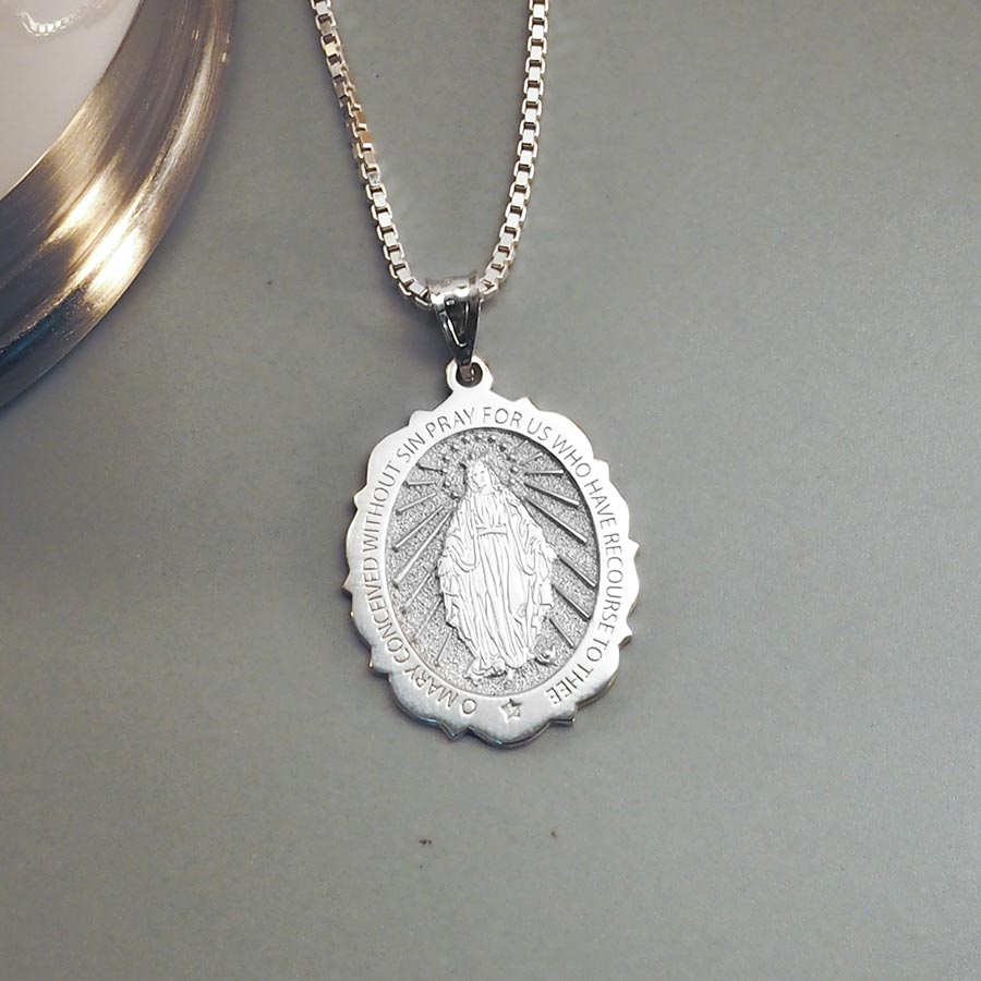 "I've purchased two Miraculous Medals from you at different times. Both times I've been highly satisfied. They came when expected and there were no hidden costs. Actually look so much better than pictures on site. No photo does jewelry any justice. The recent one I got was in sterling silver. I bought it for a friend for Mothers Day as she keeps admiring the one I always wear. Won't she be surprised. Thank you for your meticulous work in creating this fine jewelry."