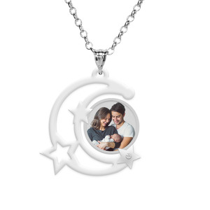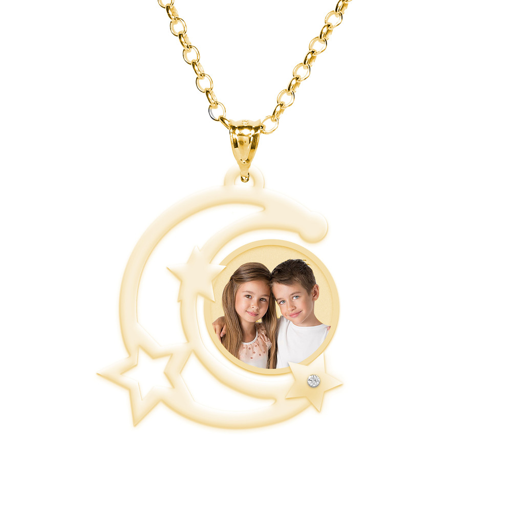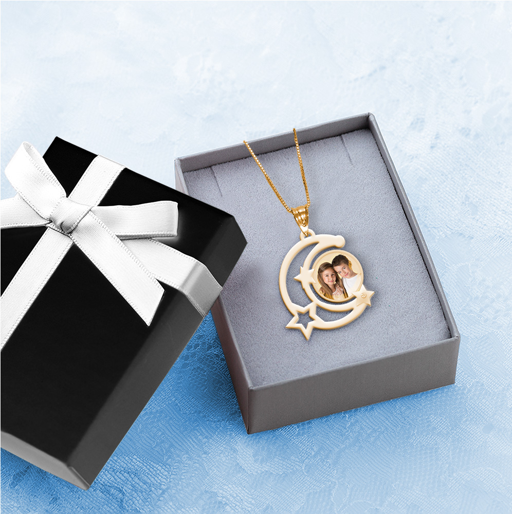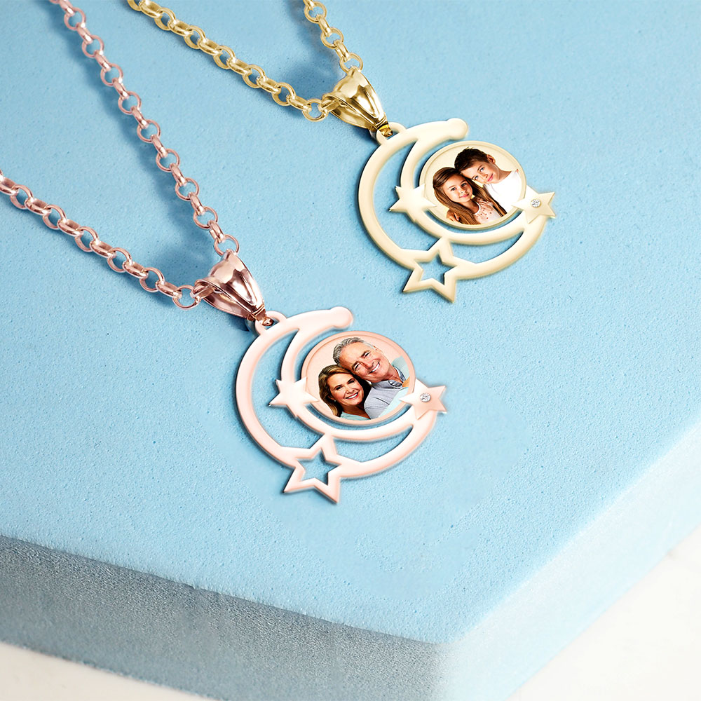 This Moon Silhouette w/ Stars Photo Pendant necklace is sure to become your favorite piece of jewelry!