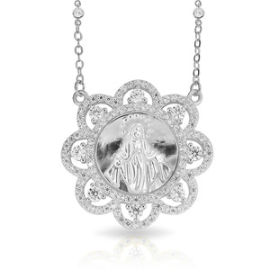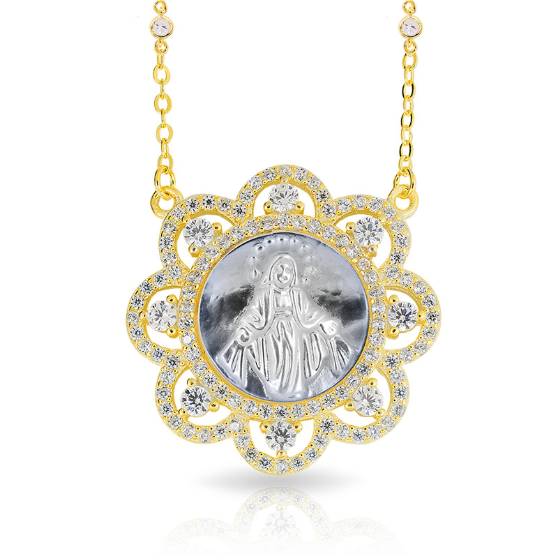 Mother of Pearl Miraculous Round Medal with CZ Ornate Border