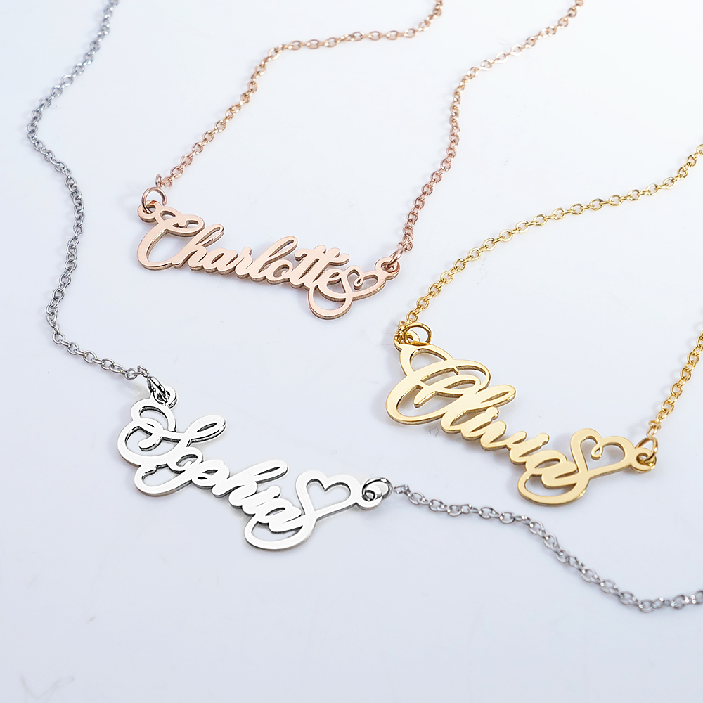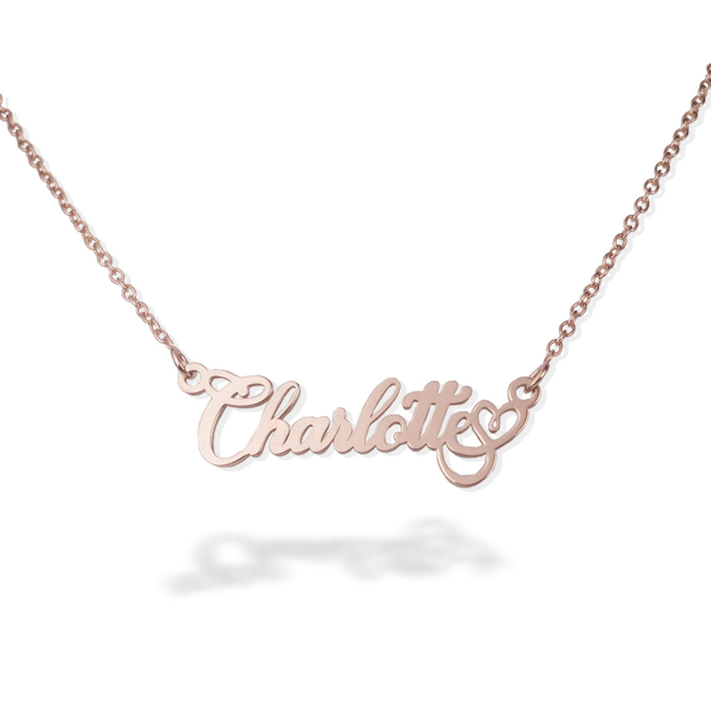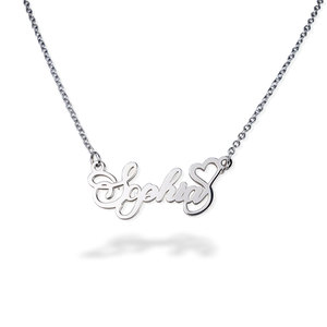 Show off your name in an eye-catching way with every wear. The polished heart-shaped pendant and script font create a necklace thats both romantic and chic. Wear it on its own for a delicate look or layer it with other dainty necklaces.