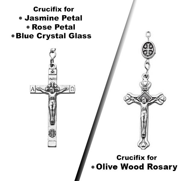 Choose from Blue Glass Crystal, Jasmine Petal, Rose Petal, and Olive Wood Rosary Beads