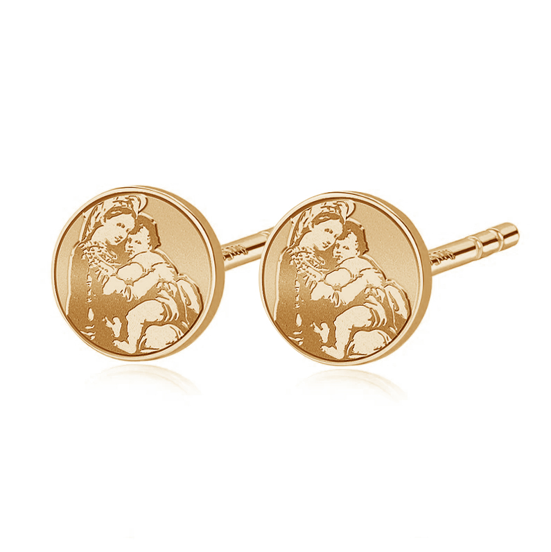Image on the Earrings Portray the Virgin Mary holding the baby Jesus. The engraved image is based on the Raphael Sanzio painting "Madonna of the Chair."