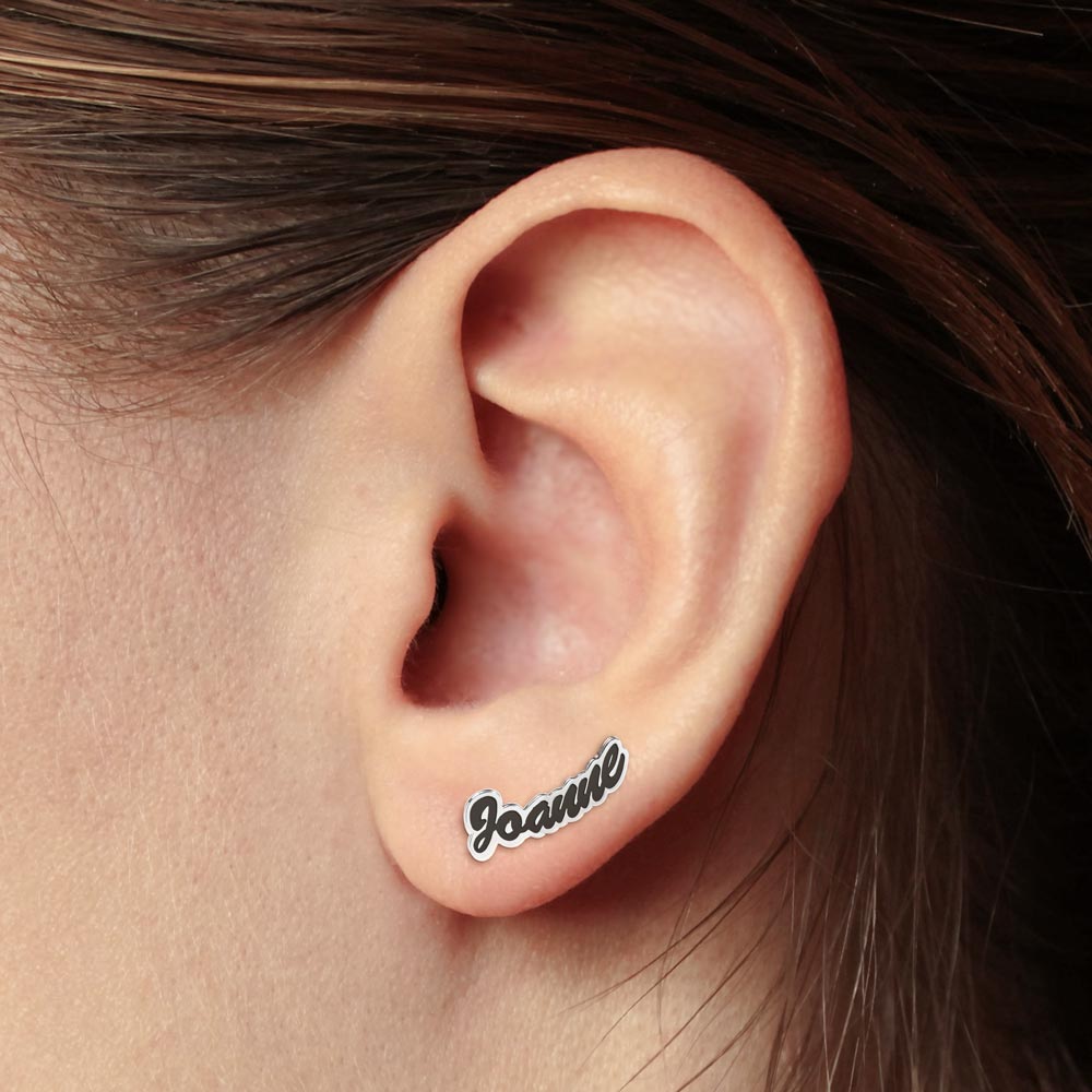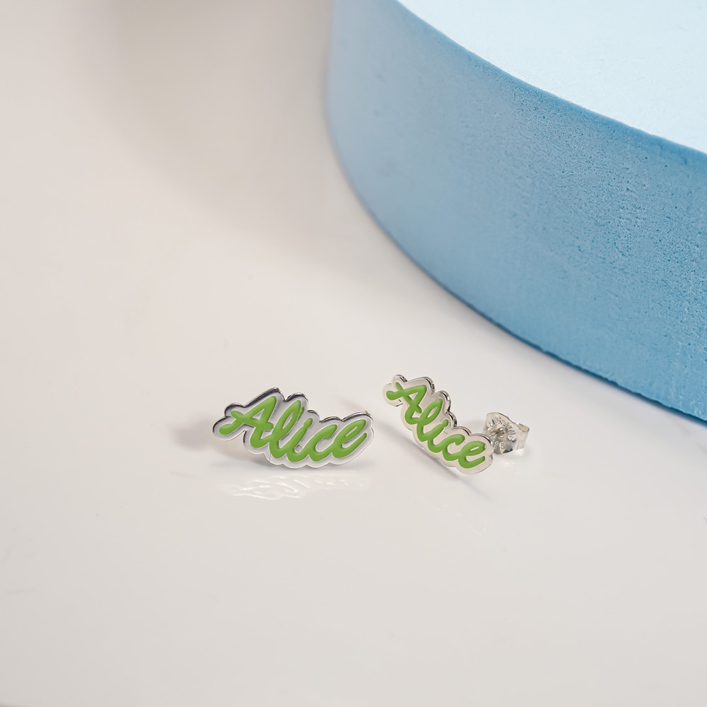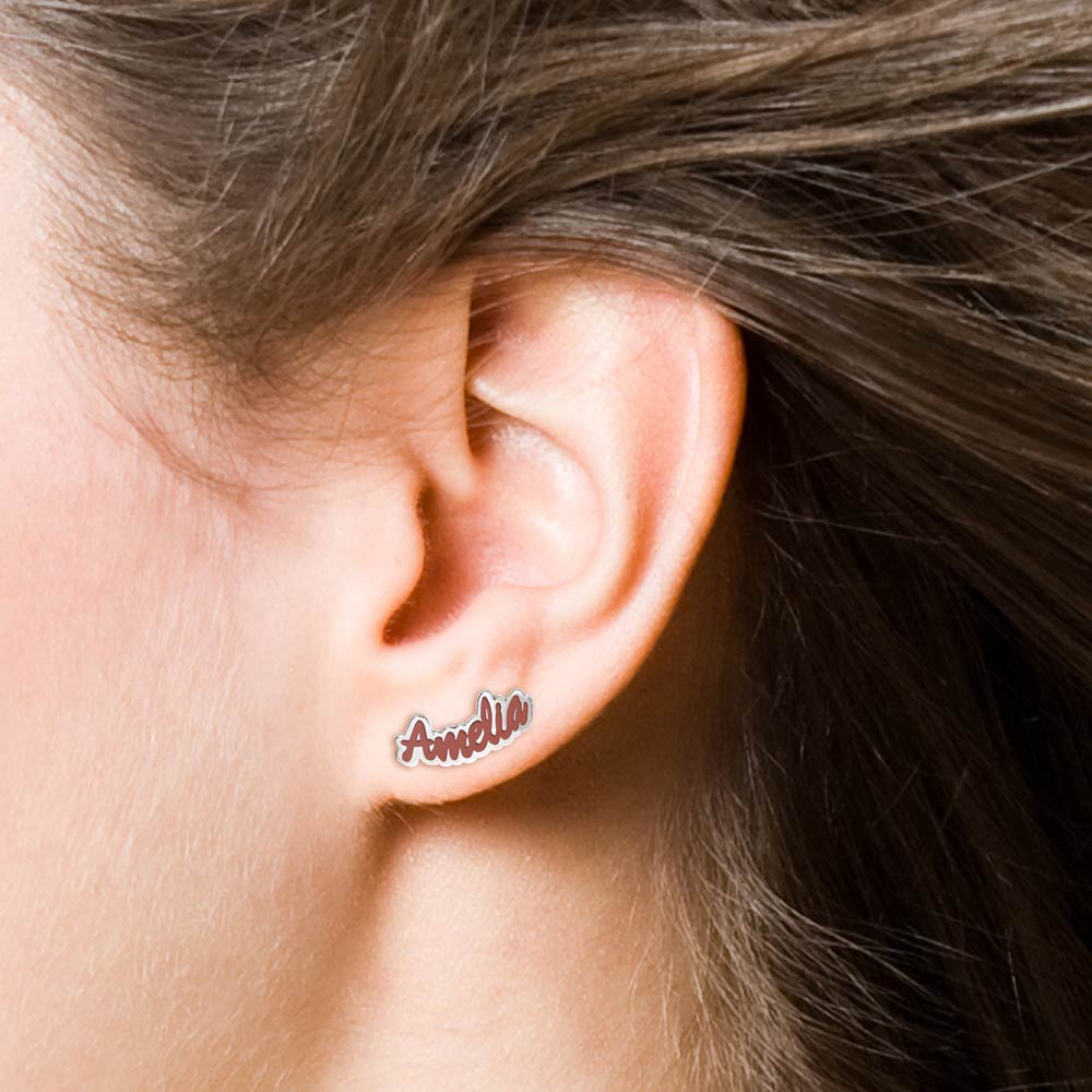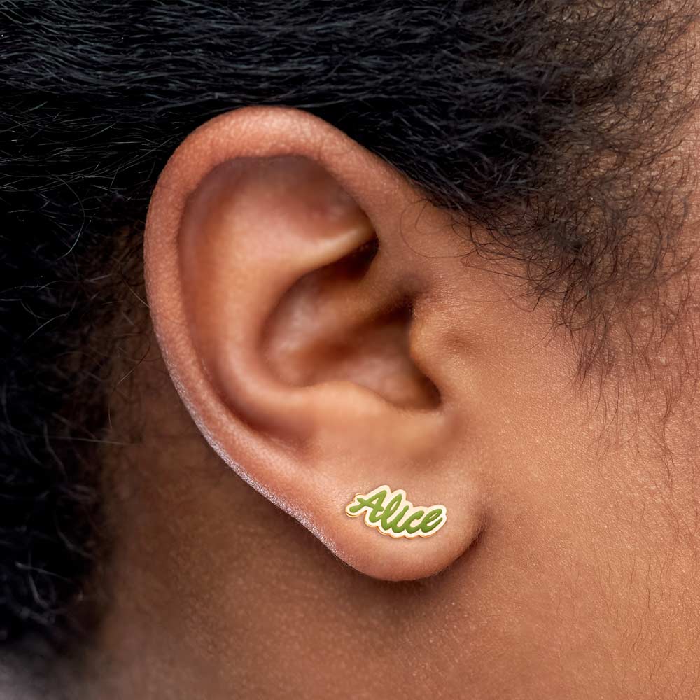 This pair of Color Enamel Script Name Earrings is available in Solid .925 Sterling Silver, Gold Plated, Rose Gold