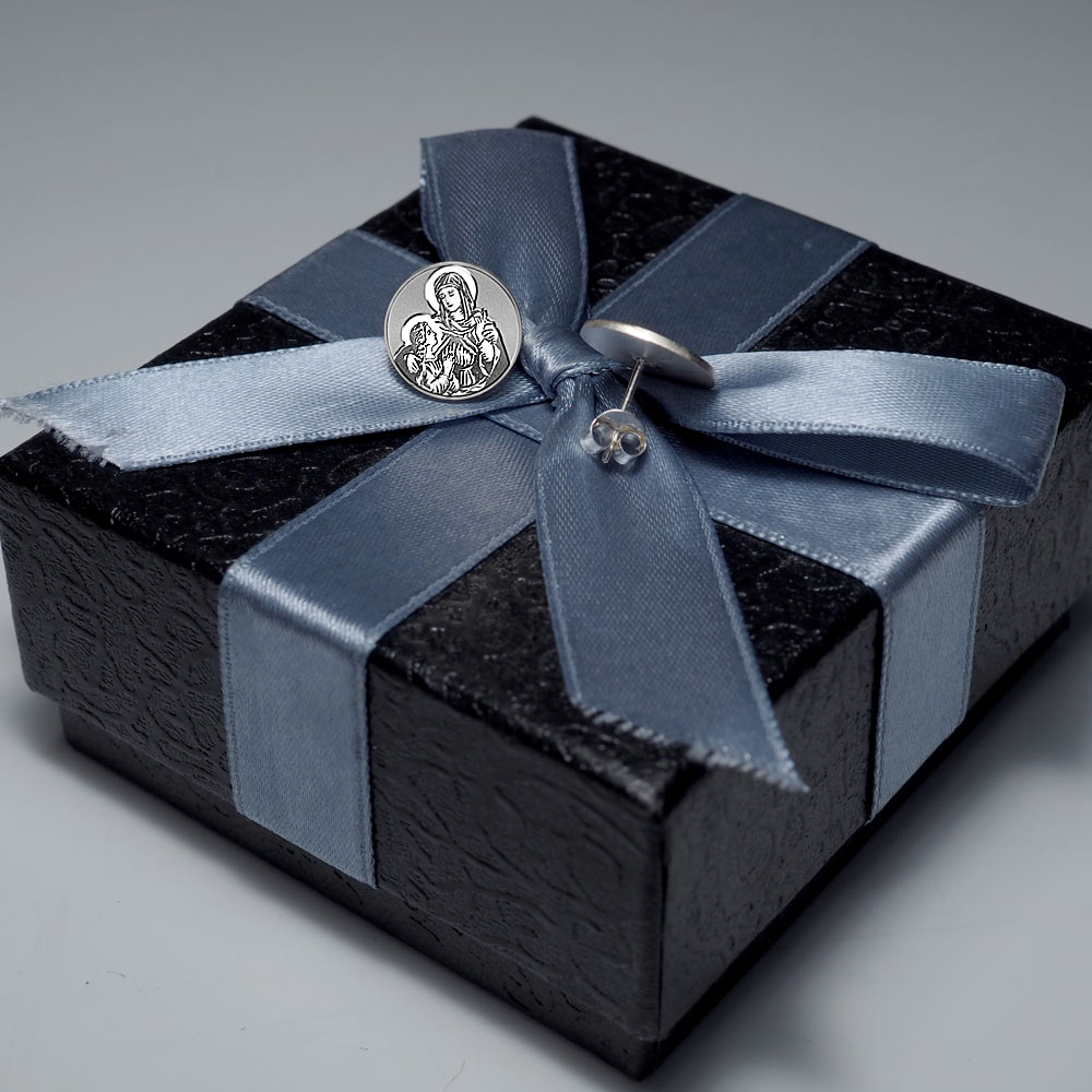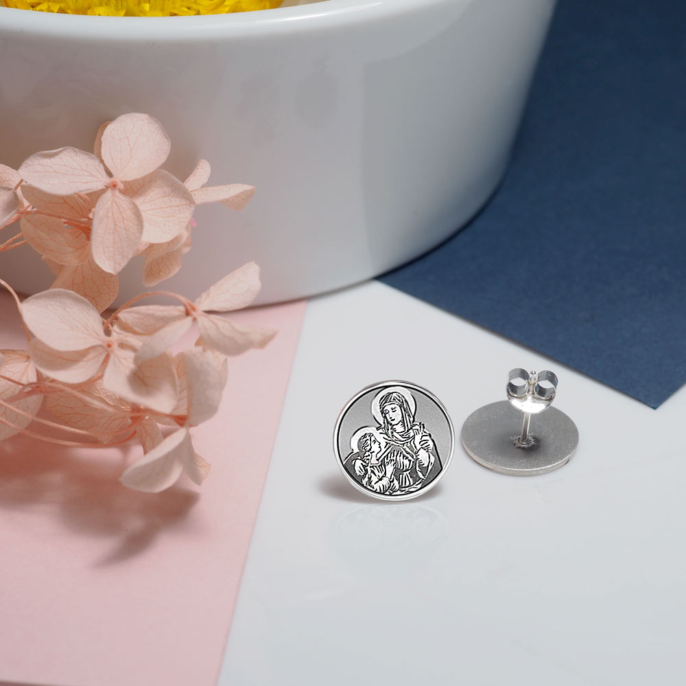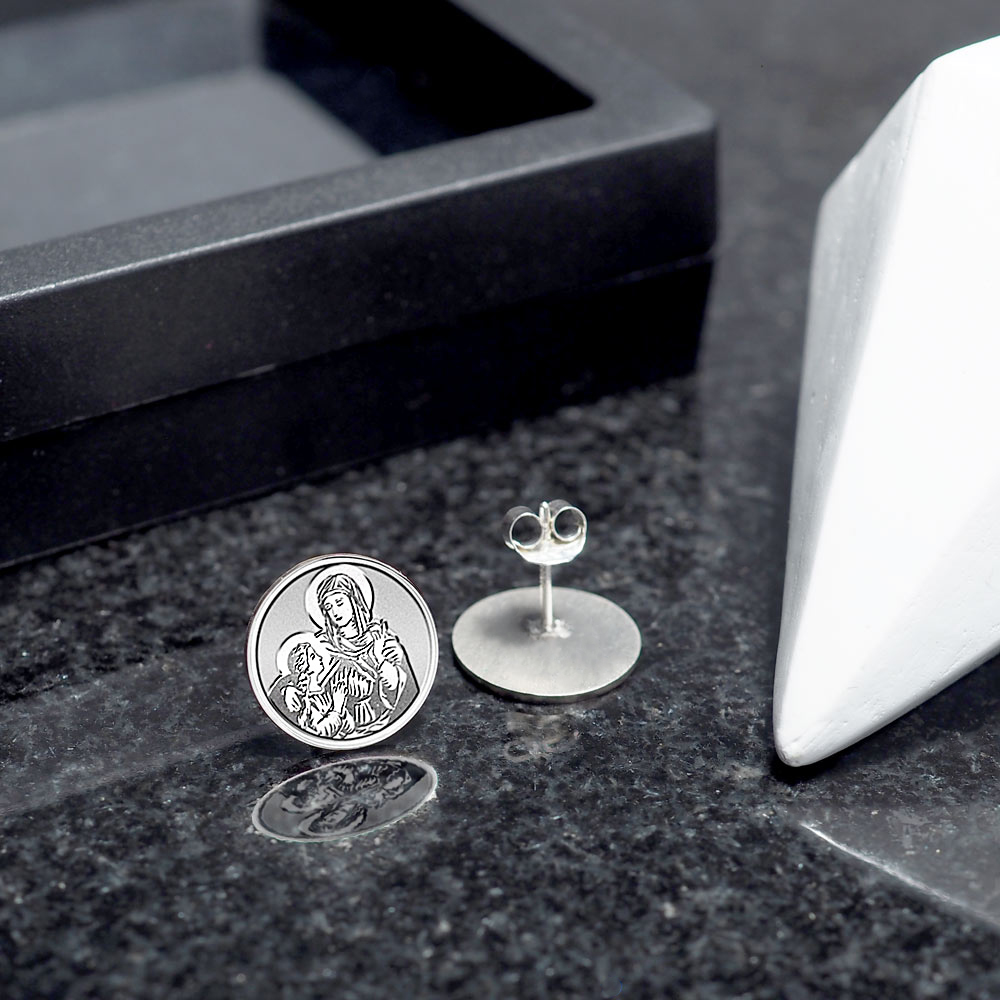 This pair of high polished saint earrings is available in Solid .925 Sterling Silver, Gold Plated, or Solid 14k Gold