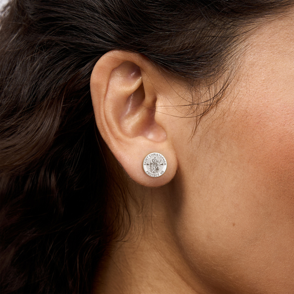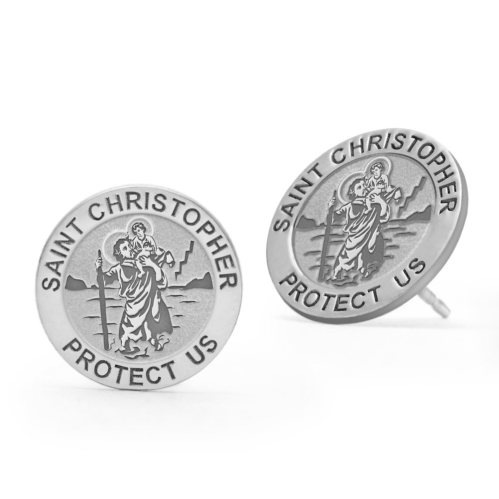 This pair of high polished saint earrings is available in Solid .925 Sterling Silver, Gold Plated, or Solid 14k Gold