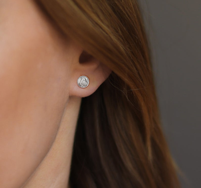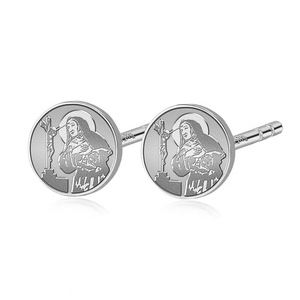 This pair of high polished saint earrings is available in Solid .925 Sterling Silver, Gold Plated, or Solid 14k Gold
