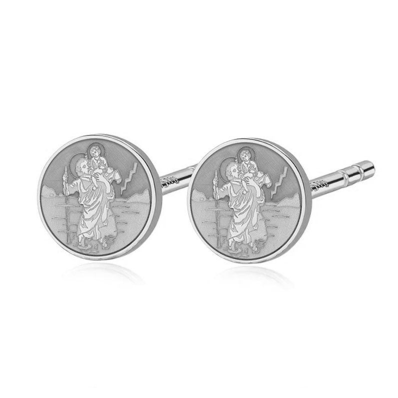 This pair of high polished saint earrings is available in Solid .925 Sterling Silver, Gold Plated, or Solid 14k Gold